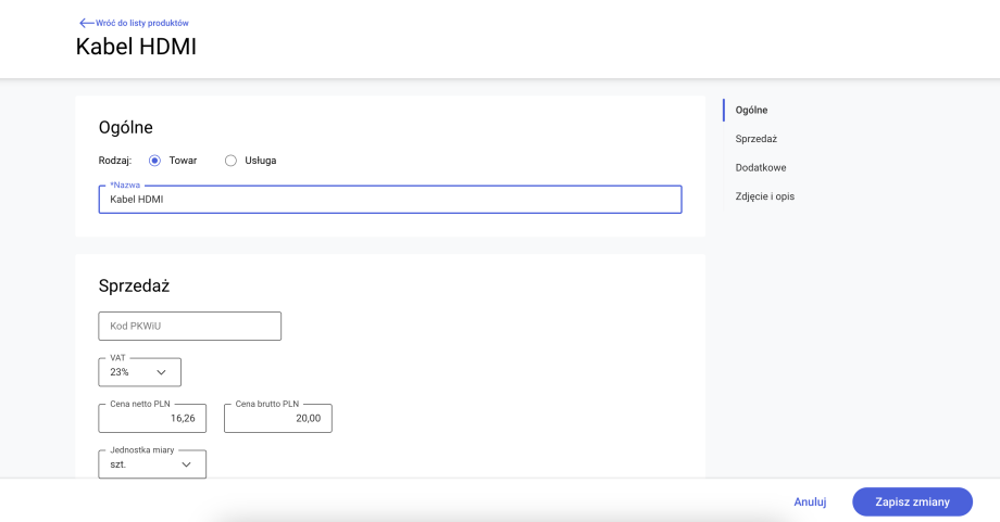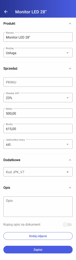 Otworzy się wówczas formularz nowego produktu. Należy na nim określić czy produkt jest towarem czy usługą oraz uzupełnić dane o produkcie: nazwę, cenę, stawkę VAT, jednostkę miary. Jest też możliwość dodania kodu JPK_V7, opisu czy zdjęcia produktu.