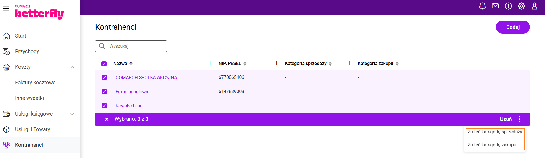 Na liście Kontrahenci, po zaznaczeniu jednego lub więcej kontrahentów, w menu kontekstowym dostępne są opcje Zmień kategorię sprzedaży oraz Zmień kategorię zakupu.