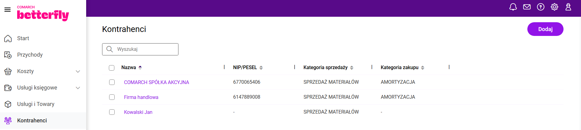 Na liście Kontrahenci przypisane kategorie są widoczne w kolumnach: Kategoria sprzedaży i Kategoria zakupu.