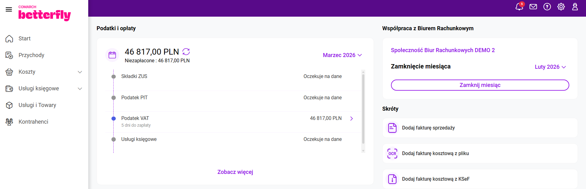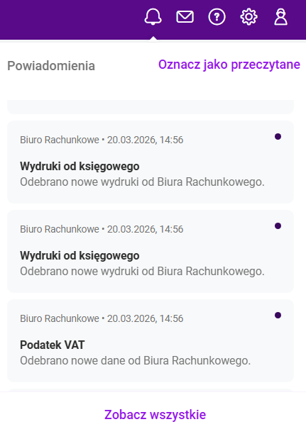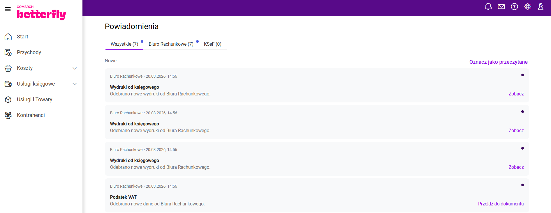 Każdy komunikat ma oznaczenie niebieskiej kropki, jeśli jest nieprzeczytany. Komunikaty można oznaczać zbiorczo poprzez opcję „Oznacz jako przeczytane” lub pojedynczo. Jeśli komunikat dotyczy konkretnego dokumentu, po kliknięciu nastąpi automatyczne przejście np. do płatności z Biura Rachunkowego lub faktury sprzedaży wysłanej do KSeF.