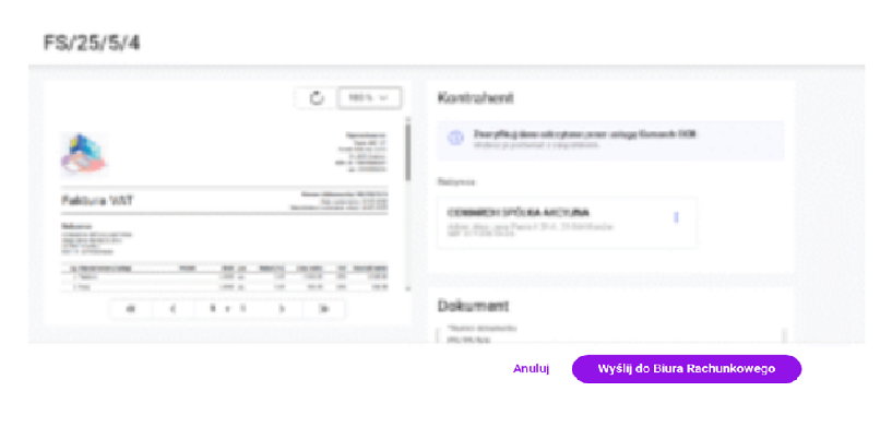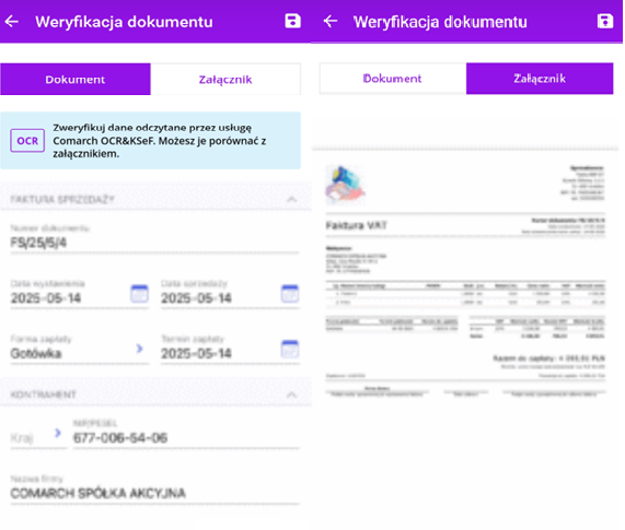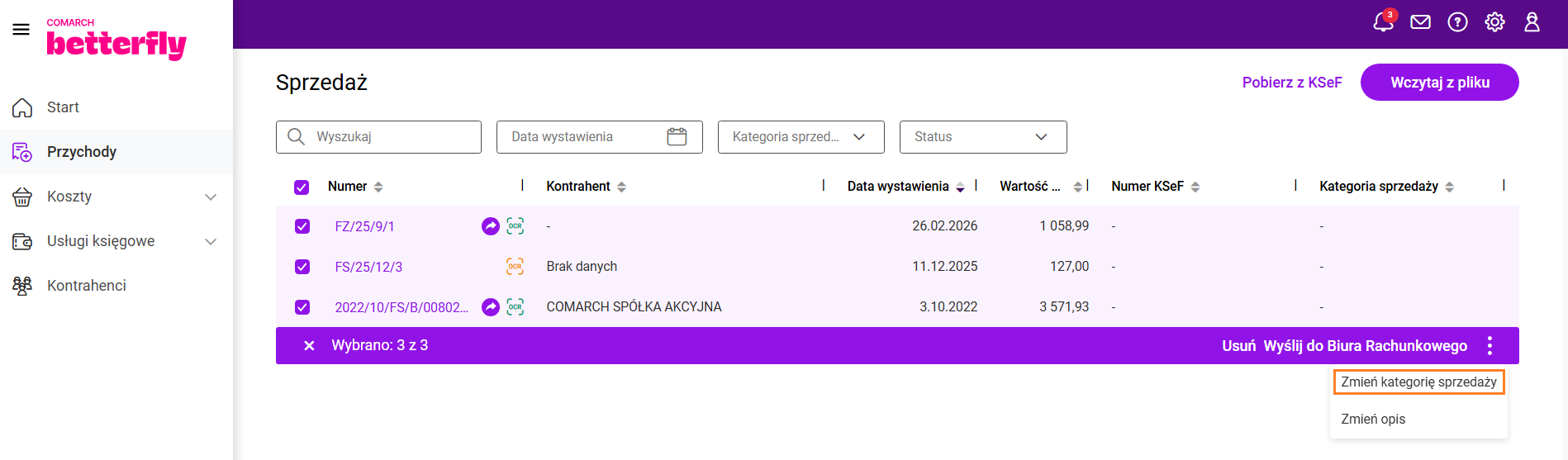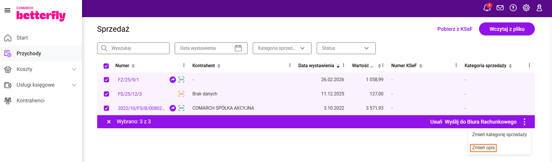 Po wykonaniu zdjęcia lub wybraniu pliku w aplikacji mobilnej, dostępna jest opcja edycji: zmiana kolorów, odwrócenie obrazu czy przycięcie obszaru dokumentu. Po zakończeniu edycji można przejść do kolejnego kroku. Odczytywanie danych z dokumentu Pliki można wczytywać do programu: Podczas odczytu dokumentu przez OCR&KSeF, rozpoznawane są następujące dane: Jeżeli OCR&KSeF rozpozna dane kontrahenta, który nie znajduje się jeszcze w bazie, istnieje możliwość zapisania jego karty. W przypadku różnicy między zapisanymi danymi a nowymi, użytkownik ma możliwość ich aktualizacji lub wyboru innego kontrahenta. Weryfikacja i przesyłanie dokumentu Po odczytaniu dokumentu przez Comarch OCR&KSeF przez aplikację przeglądarkową plik zostanie zwizualizowany w oknie po lewej stronie ekranu – po prawej stronie zostaną wyświetlone odczytane dane, które można w razie potrzeby skorygować. Aby szybko zweryfikować dokument w aplikacji mobilnej, można skorzystać z zakładki Załącznik, gdzie wyświetlona jest odczytana faktura. Na dokumentach sprzedaży można również ustawić odpowiednie kody JPK_V7 dla transakcji, co jest niezbędne do prawidłowego sporządzenia deklaracji VAT w biurze rachunkowym (JPK_V7M lub JPK_V7K). W sekcji Informacje dla Biura Rachunkowego użytkownik może wybrać kategorię sprzedaży oraz dodać dodatkowe informacje dla księgowego. Aby zatwierdzić odczytane dane, należy kliknąć przycisk Wyślij do Biura Rachunkowego. Po przesłaniu dokumentu, będzie on dostępny do odczytu, a załącznik można podejrzeć w każdej chwili. Kliknięcie na przycisk Anuluj nie zapisze wprowadzonych przez użytkownika zmian na formularzu – na liście będzie widoczny zeskanowany dokument z danymi jakie zostały automatycznie odczytane. Operacje seryjne na liście Sprzedaż Na liście Sprzedaż są dostępne następujące operacje seryjne: Opcje Wyślij do Biura Rachunkowego, Zmień kategorię sprzedaży oraz Zmień opis są dostępne, jeśli: Seryjna zmiana kategorii sprzedaży Na liście Sprzedaż, po zaznaczeniu wybranych dokumentów, w menu kontekstowym widoczna jest opcja Zmień kategorię sprzedaży. Po jej wybraniu wyświetli się okno, w którym można wybrać nową kategorię sprzedaży. Jeśli na zaznaczonych dokumentach była przypisana inna kategoria, zostanie ona zmieniona na nową. Seryjna zmiana opisu Na liście Sprzedaż po zaznaczeniu wybranych dokumentów, dostępna jest opcja Zmień opis. Po jej wyborze wyświetli się okno, w którym można wprowadzić Opis dla Księgowego. Seryjna wysyłka faktur do biura rachunkowego Na liście Sprzedaż, po zaznaczeniu dokumentów sprzedaży dodanych przez OCR&KSeF, dostępna jest opcja Wyślij do Biura Rachunkowego. Jeśli wśród zaznaczonych faktur znajduje się dokument, który już został wysłany zostanie wyświetlony komunikat jak poniżej: Po wybraniu opcji Tak, wyślij nastąpi weryfikacja konfiguracji Internetowej Wymiany Dokumentów (IWD). Jeśli IWD jest poprawnie skonfigurowane, zostanie wyświetlone okno z potwierdzeniem wysyłki dokumentów: Po zakończeniu przesyłania pojawi się poniższy toast: Każdy użytkownik ma możliwość bezpłatnego przesłania do 20 stron miesięcznie. Jeśli potrzebna jest większa ilość, można rozszerzyć ilość stron lub wykupić abonament w sklepie Comarch. Więcej informacji na temat wystawiania faktur sprzedaży bezpośrednio w programie Comarch Betterfly moduł eFaktury można znaleźć w artykule: Jak wystawić fakturę sprzedaży w module eFaktury?