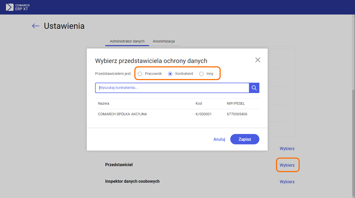W pozostałych przypadkach program daje nam możliwość ustawienia jako podmiotu jednego z pracowników lub kontrahentów, zapisanych w naszej bazie. Do wybrania odpowiedniego typu służą kropeczki widoczne w trybie edycji każdej z sekcji. Wybranie opcji Inny pozwala z kolei na dodanie innego podmiotu, który nie figuruje w naszej bazie.