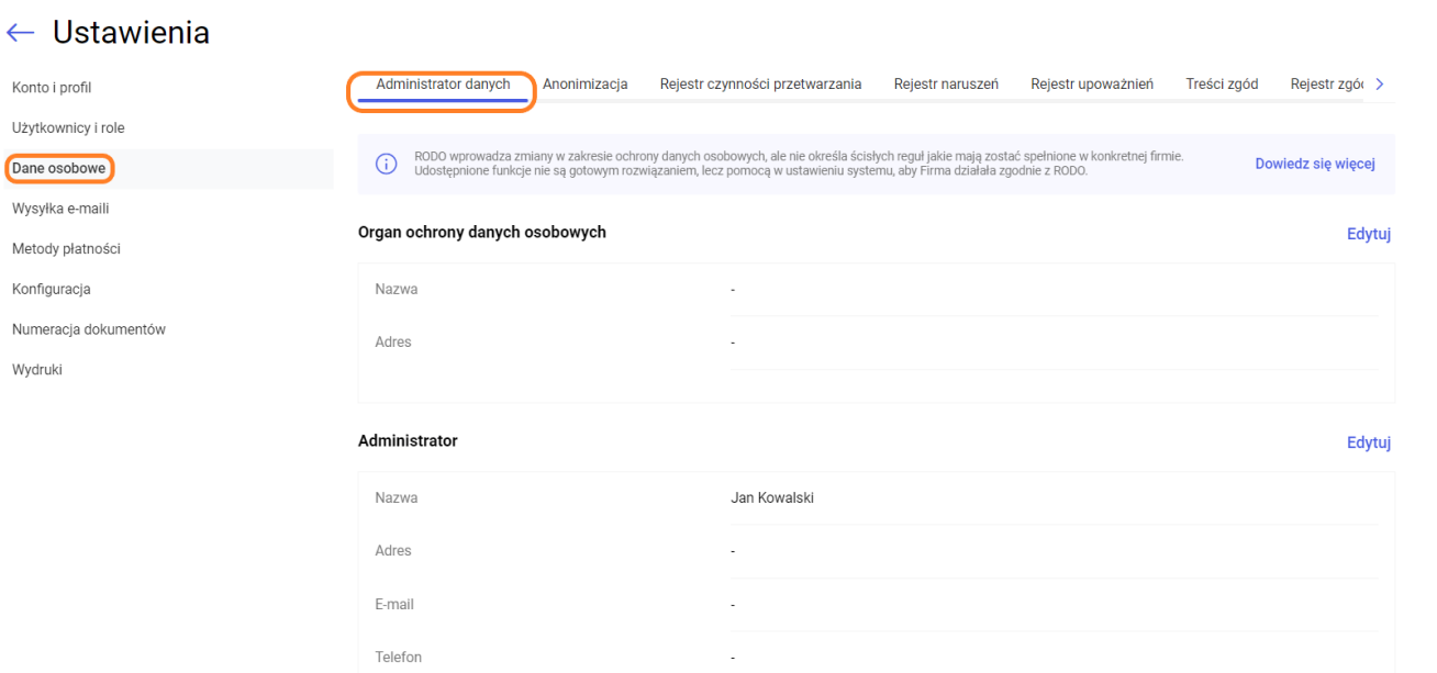 Administrator, jako główny z podmiotów, musi być uzupełniony. Pozostałe sekcje możemy pozostawić puste.