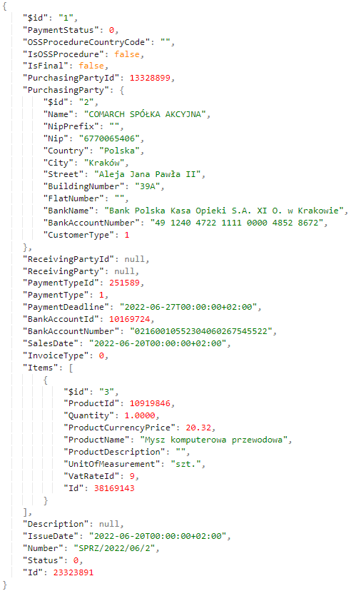 Możliwe jest także pobranie danych dotyczących określonego dokumentu faktury sprzedaży: