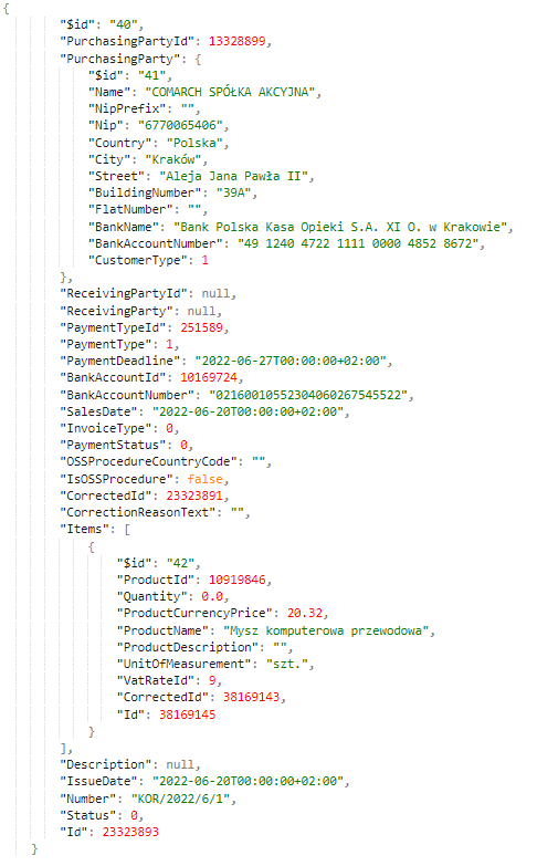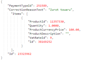 Przykładowe zapytanie JSON (zwrot towaru, faktura korygująca o Id=23323962):