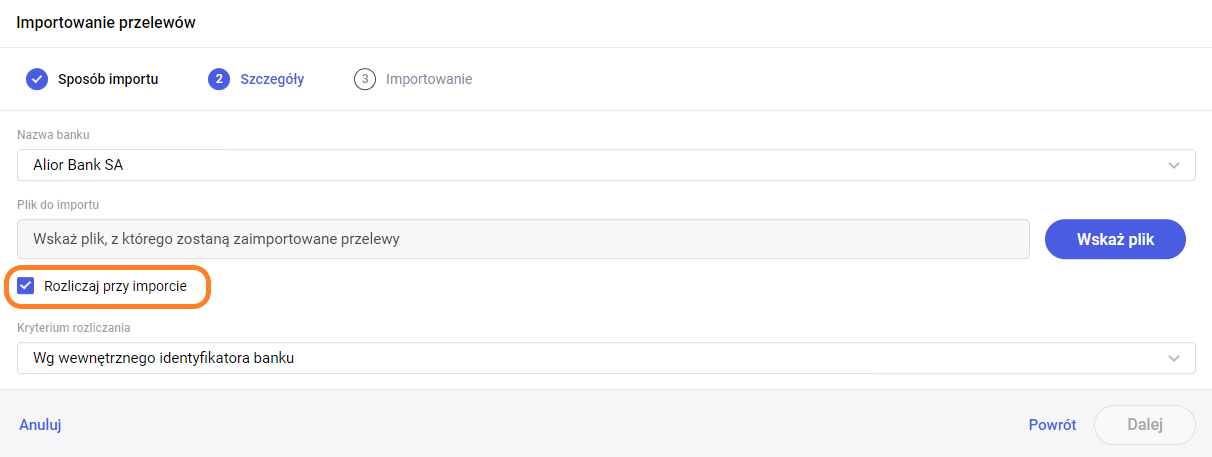 Aby przelewy zostały rozliczone na oknie importu należy zaznaczyć parametr Rozliczaj przy imporcie.