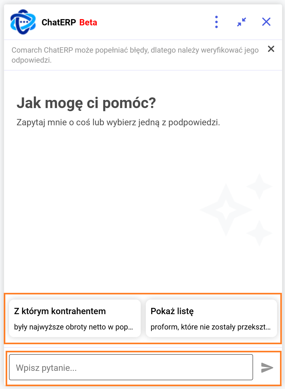 Następnie pojawi się okno służące do konwersacji z Comarch ChatERP. Można zacząć rozmowę od jednego z poleceń, które podpowiadają się w dolnej części okna lub zadać własne pytanie.