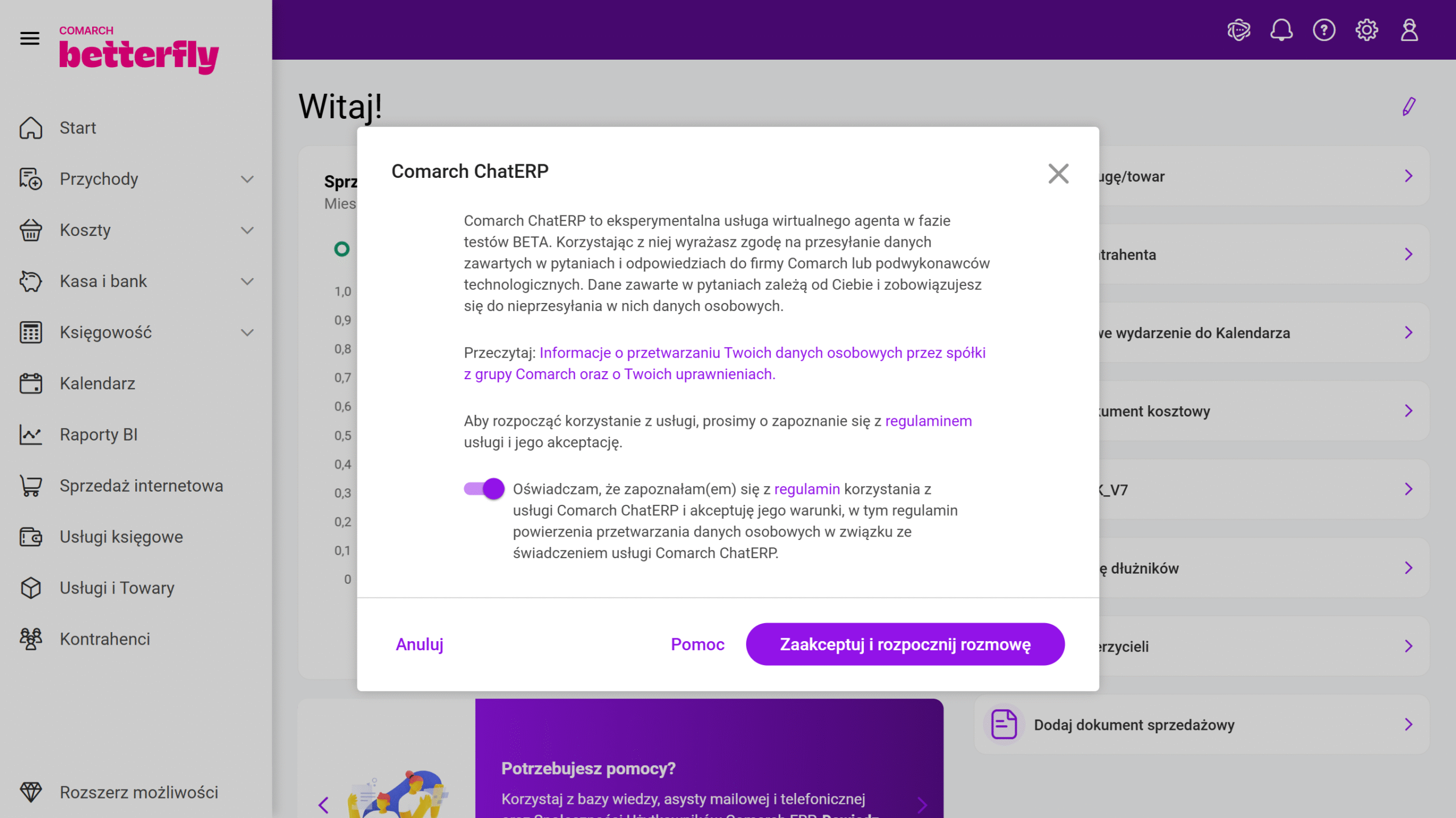 Po kliknięciu na przycisk „ChatERP” najpierw należy zapoznać się z informacjami prawnymi i zatwierdzić regulamin usługi Comarch ChatERP.