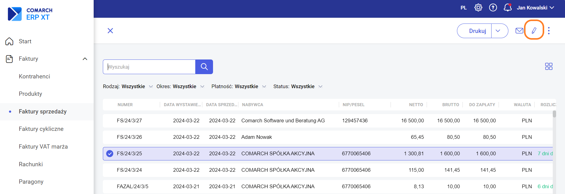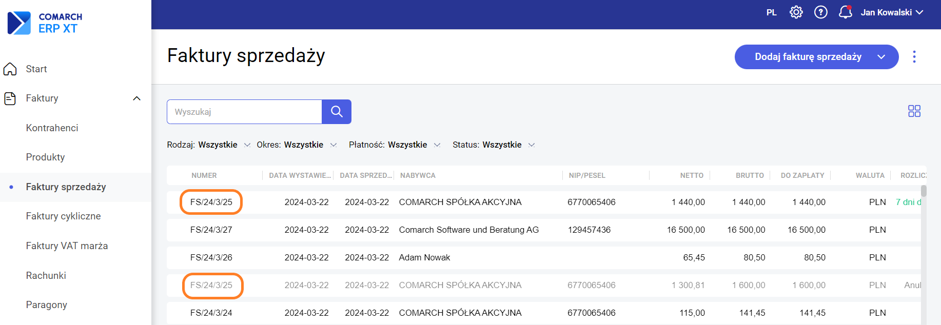 Na liście dokumentów anulowany dokument jest wyszarzony, a nowy posiada wybrany przez nas numer.