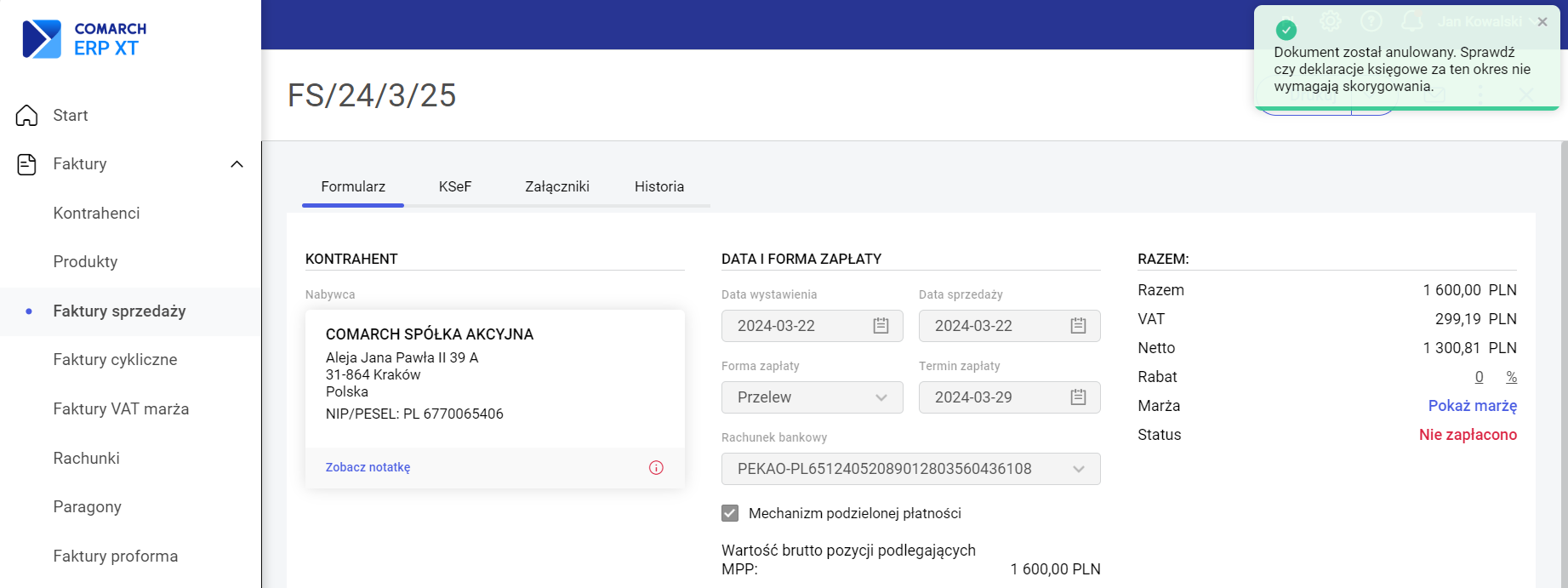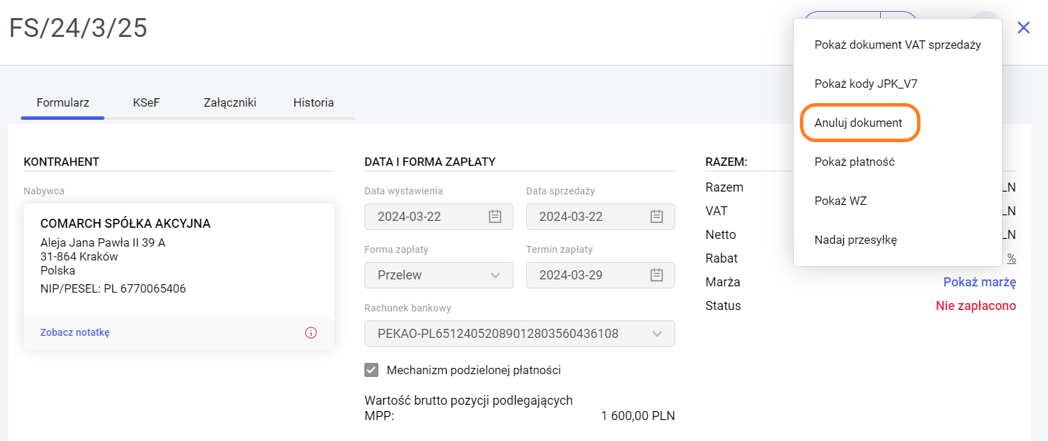 Krok drugi – wybieramy opcję „Anuluj dokument”.