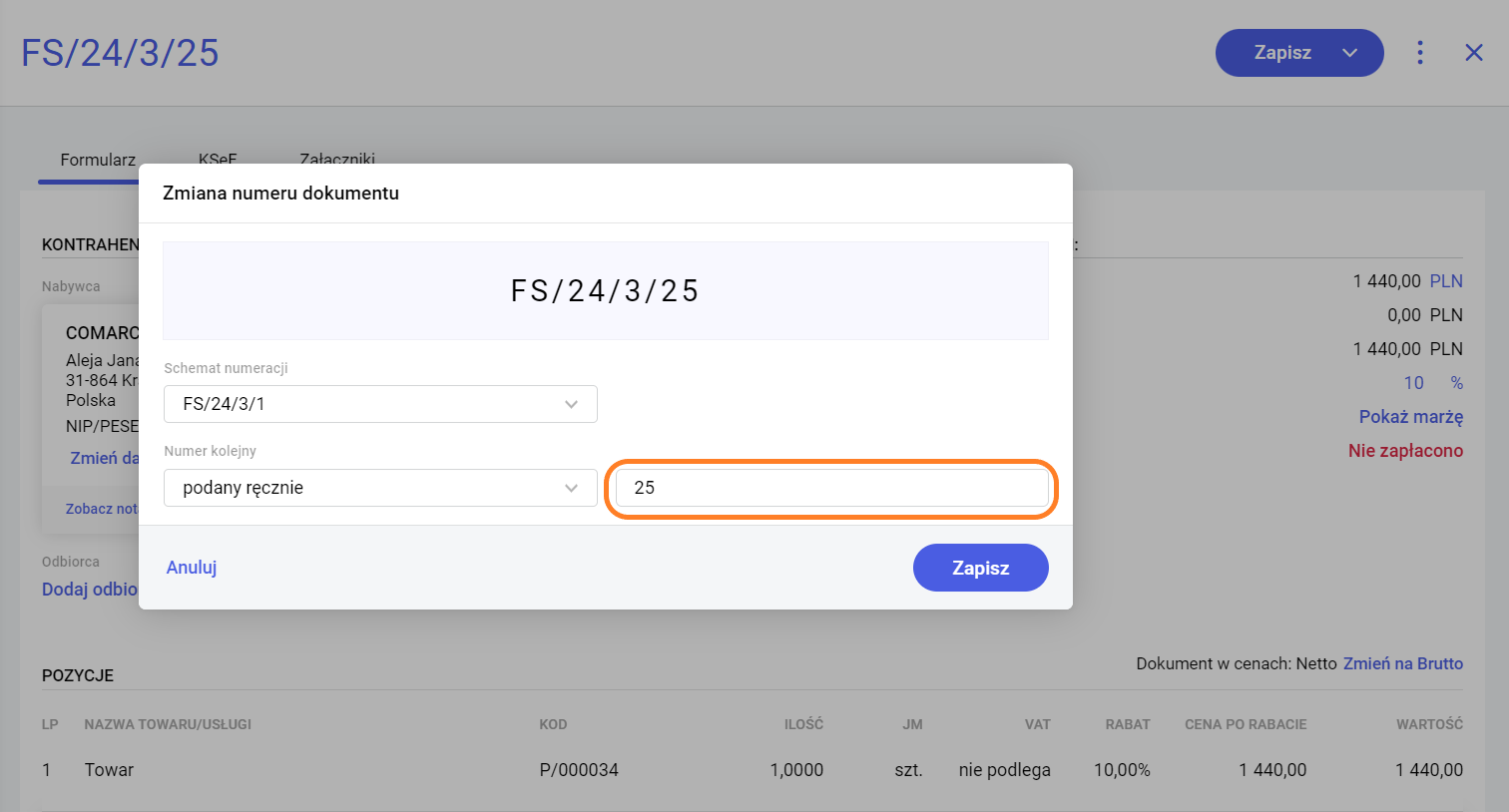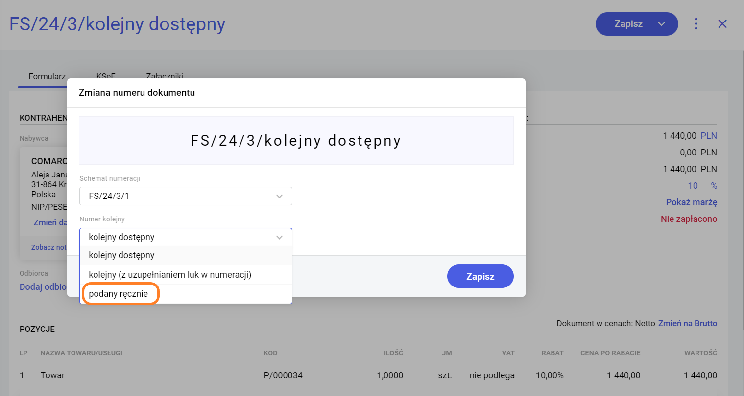 Następnie wpisujemy odpowiedni numer i jeśli pozostałe dane są poprawnie podane, możemy zapisać (lub zatwierdzić) dokument.