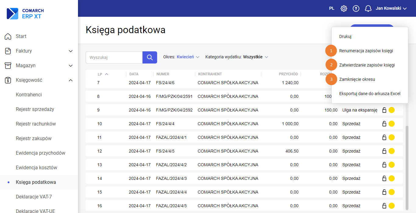 Krok 2 – Po renumeracji należy wybrać Zatwierdzanie zapisów księgi. Po zatwierdzeniu, zapis nie może zostać usunięty ani poprawiony. Można go skreślić i wówczas będzie widoczny na liście w kolorze szarym oraz na wydrukach jako przekreślony (nie będzie brany pod uwagę w podsumowaniach).