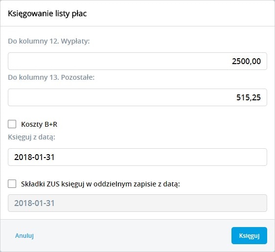 Składki ZUS można również zaksięgować w oddzielnym zapisie po zaznaczeniu Składki ZUS księguj w oddzielnym zapisie z datą.