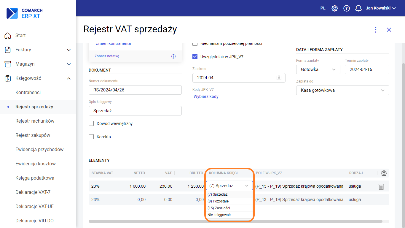 Dokumenty przychodowe lub kosztowe można wprowadzać bezpośrednio do rejestrów VAT (zakupu, sprzedaży) z pominięciem części handlowej wybierając Księgowość >>> Rejestr sprzedaży/ Rejestr zakupów. Po dodaniu nowego zapisu do rejestru VAT następuje automatyczne księgowanie do Księgi Podatkowej, według ustawień znajdujących się w polu Kolumna księgi.