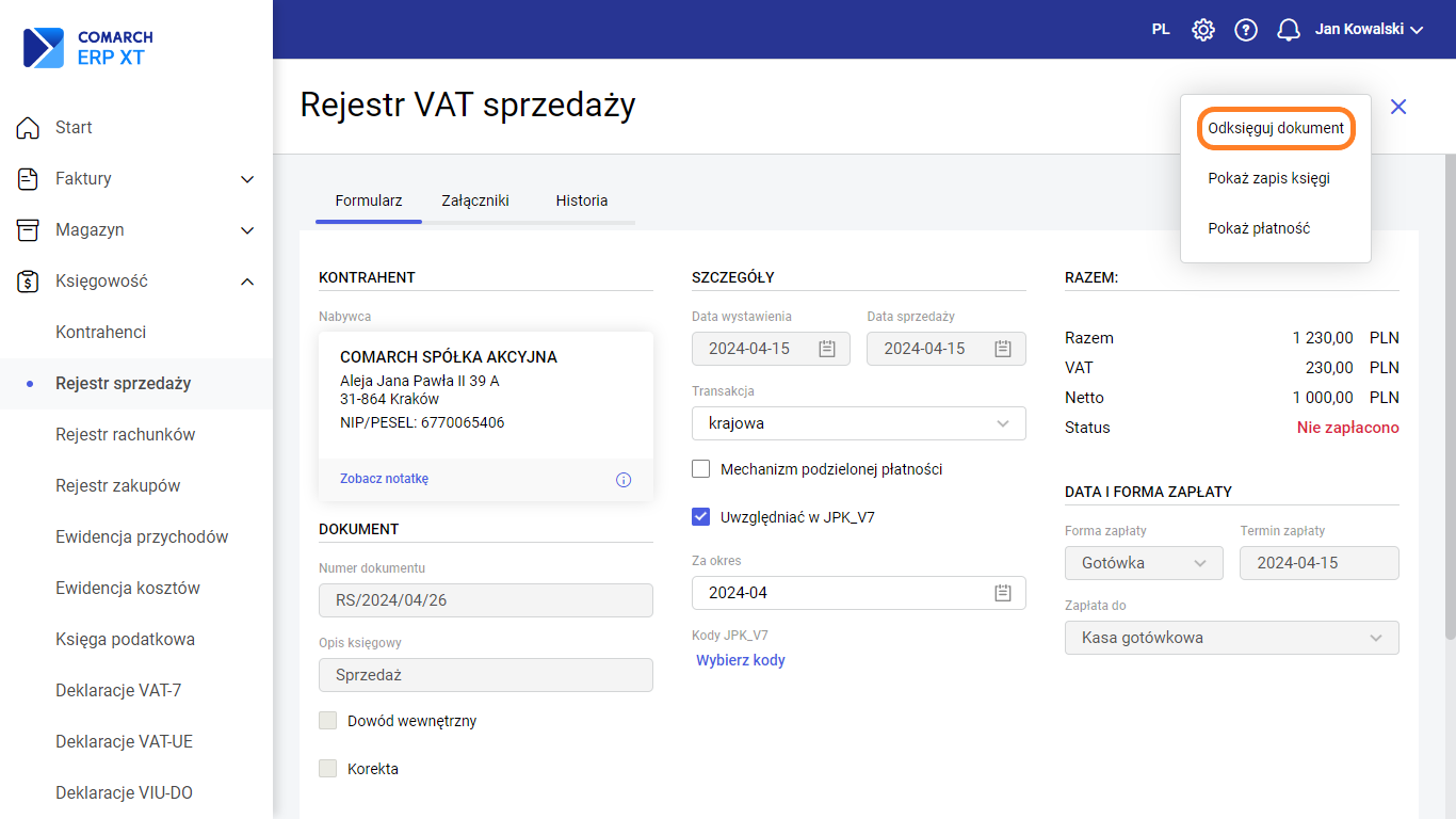 Dokument rejestru, który został przeniesiony do księgi (na liście oznaczony zamkniętą kłódką), nie podlega modyfikacji. W przypadku konieczności wykonania zmian należy odksięgować dokument, wybierając z wnętrza formularza opcję Odksięguj dokument.