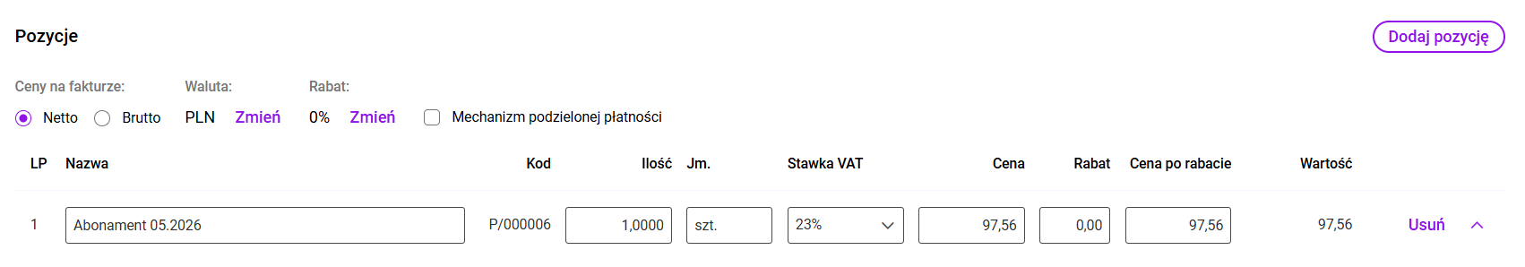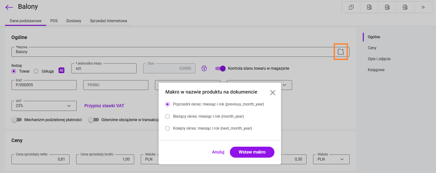 Po wybraniu produktu na dokument, w nazwę makra zostaną podstawione odpowiednie dane w oparciu o datę sprzedaży lub datę wystawienia dokumentu. Odpowiedni okres będzie prezentowany w postaci MM. YYYY: