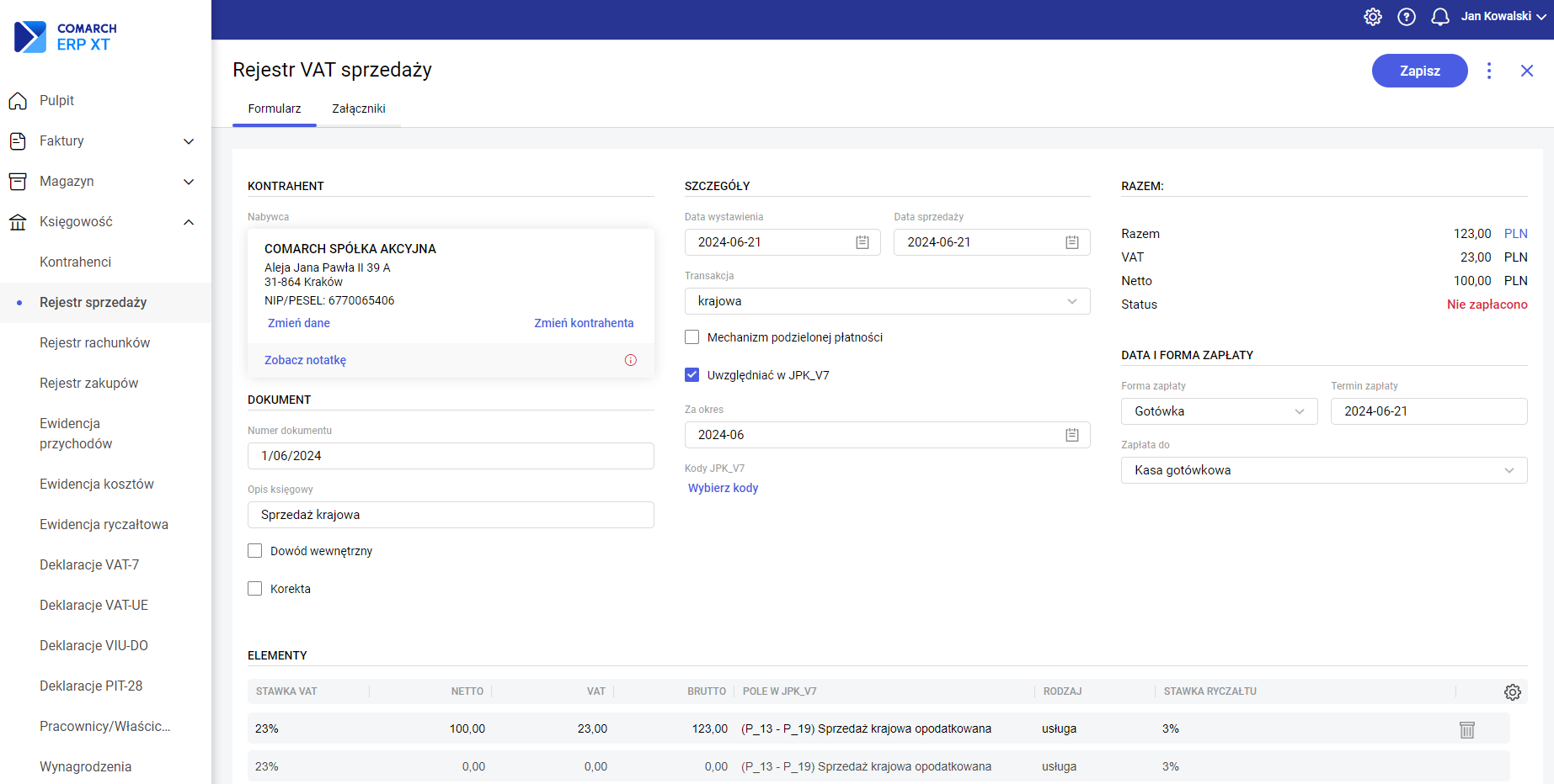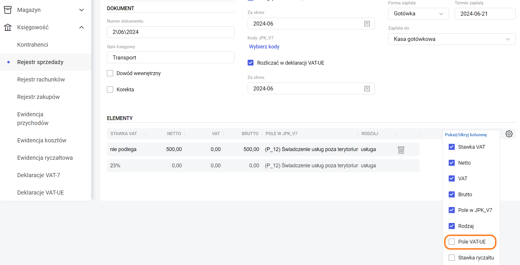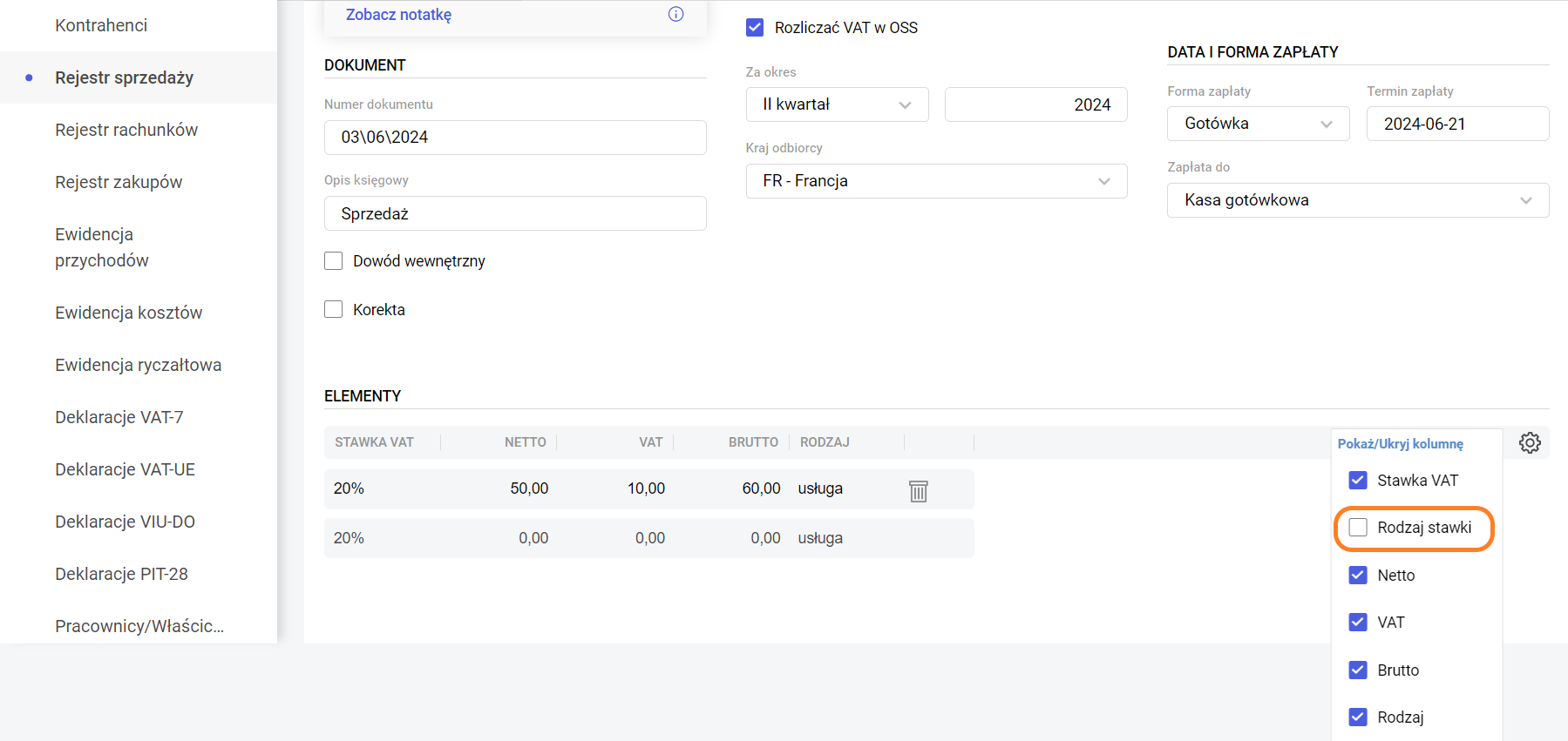 Transakcja – pole określające rodzaj transakcji. Jest to istotne przy kwalifikacji faktur do określonych pól na deklaracji. W przypadku wybrania w polu Kontrahent osoby o statusie wewnątrzunijny, wewnątrzunijny trójstronny lub pozaunijny, pole Transakcja przyjmie automatycznie adekwatną wartość. Mechanizm podzielonej płatności – zakłada rozdzielenie płatności za nabyty towar lub usługę na dwa odrębne rachunki – rachunek bankowy dostawcy oraz specjalny rachunek VAT. Parametr Mechanizm podzielonej płatności zaznaczany jest na dokumencie w rejestrze VAT sprzedaży/zakupu automatycznie po spełnieniu poniższych warunków: Razem/VAT/Netto – pola podsumowujące wartość dokumentu z rozróżnieniem na wartości brutto, VAT i netto. Dla dokumentów walutowych prezentowana jest dodatkowo wartość w złotych, przeliczona po kursie zastosowanym na dokumencie. Waluta – możliwość wyboru waluty dokumentu, w tym waluty obcej, na podstawie tabeli A udostępnionej przez NBP. Lista skonstruowana jest w sposób alfabetyczny, z wyjątkiem pierwszych pięciu pozycji z najczęściej wybieranymi walutami. Naliczaj różnice kursowe od kwoty – pole widoczne dla Rejestru VAT zakupów po wybraniu waluty innej niż PLN, określające, czy różnica kursowa ma być wyliczana bez uwzględnienia VAT (netto), czy razem z nim (brutto). Dla Rejestru VAT sprzedaży pole jest niewidoczne z racji wyliczania różnicy kursowej zawsze od wartości netto faktury. Kurs na dzień – pole widoczne po wybraniu waluty innej niż PLN, określające datę kursu. Podpowiadany jest dzień poprzedni, z wyjątkiem sobót i niedziel oraz dni wolnych od pracy. Średni kurs NBP/Kurs ręczny – pole widoczne po wybraniu waluty innej niż PLN, określające typ kursu waluty. Użytkownik ma możliwość wykorzystania zaimportowanej wartości kursu średniego NBP lub wprowadzenia ręcznego. Import kursów odbywa się codziennie około godz. 12:00. Kurs – pole widoczne po wybraniu waluty innej niż PLN, określające licznik i mianownik kursu. Po wybraniu w polu typ kursu wartości Średni kurs NBP podstawia się automatycznie wartość kursu, bez możliwości modyfikacji. Po wybraniu w polu typ kursu wartości Kurs ręczny, pole kurs staje się aktywne, z możliwością wprowadzenia odpowiedniej wartości kursu. Forma zapłaty – określa formę zapłaty za fakturę. Dostępne opcje to: gotówka, przelew i karta. Użytkownik może zdefiniować własne formy zapłaty, wpisując ich nazwy i wybierając Dodaj, a następnie uzupełniając Nazwę oraz Termin płatności. Termin zapłaty – ustalony termin zapłaty za fakturę. Nie zapłacono/Częściowo zapłacono/Zapłacono – przycisk określający stan zapłaty za fakturę. Po jego wciśnięciu jest możliwość rozliczenia dokumentu, rozliczenia częściowego lub usunięcia rozliczenia. Po zapisaniu dokumentu z dokonaną zapłatą po kursie innym, niż kurs zastosowany na dokumencie, utworzy się automatycznie dodatnia lub ujemna różnica kursowa, widoczna na liście Księga podatkowa (dla pakietu z Księgą Podatkową)/ Zapisy księgowe (dla pakietu z Księga Handlową) oraz na liście Różnice kursowe (Kasa i bank >>> Różnice kursowe) . Dolna część formularza zawiera tabelę pozycji faktury. Tabela składa się z kolumn: Stawka VAT, Netto, VAT, Brutto, Kolumna księgi (dla pakietu z Księgą Podatkową)/ Konto (dla pakietu z Księga Handlową), Pole w JPK_V7 i Rodzaj. Dla dokumentów walutowych dostępne są dodatkowe kolumny: Netto PLN, VAT PLN, Brutto PLN. Kolumna księgi wskazuje pozycję w księdze podatkowej, do której zostanie zaksięgowana pozycja faktury. W kolumnie Konto wpisujemy numer konta księgowego, na który zostanie zaksięgowana pozycja faktury. Pole w JPK_V7 określa pole na deklaracji, do którego zostanie zakwalifikowana pozycja. Rodzaj określa pozycję jako towar lub usługę, co ma znaczenie m.in. do kwalifikacji w pliku JPK_V7. Po prawej stronie ostatniej kolumny dostępny jest przycisk usuwania danego elementu. W przypadku transakcji wewnątrzunijnej/wewnątrzunijnej trójstronnej, istnieje możliwość dodania kolumny ,,Pole VAT-UE”. Pole VAT-UE określa pole na deklaracji, do którego zostanie zakwalifikowana pozycja. Aby dodać tą kolumnę należy wybrać ikonę koła zębatego widocznego po prawej stronie nagłówka kolumn i zaznaczyć kolumnę do wyświetlenia. W przypadku transakcji procedura OSS dostępna jest domyślnie ukryta kolumna „Rodzaj stawki”, która w zależności od stawki VAT ustawionej na pozycji przyjmuje wartości: podstawowa lub obniżona. Aby dodać tą kolumnę należy wybrać ikonę koła zębatego widocznego po prawej stronie nagłówka kolumn i zaznaczyć kolumnę do wyświetlenia. Zobacz także: Jak wprowadzić dokument do rejestru VAT bez wykazania w KPiR ? Jak wykonać renumerację dokumentów w rejestrze VAT? Jak wprowadzić dokument do rejestru VAT tak, aby nie był uwzględniany na deklaracji VAT-7?