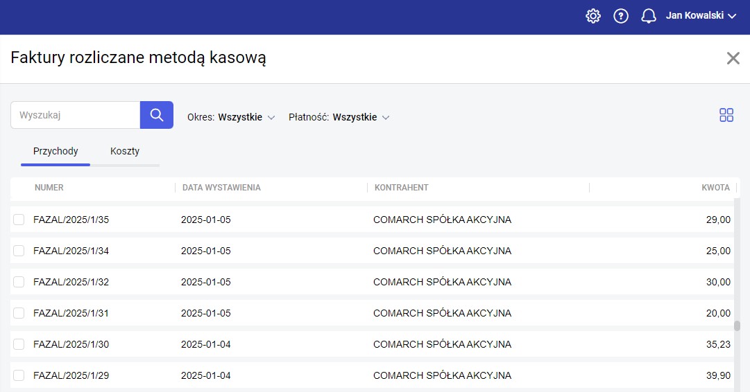 W programie Comarch Betterfly dostępna jest osobna lista dokumentów, na których został zaznaczony parametr Rozliczaj w kasowym PIT.