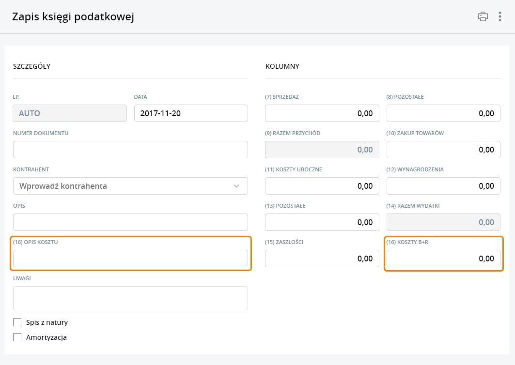 Na zapisie bezpośrednio wprowadzonym do Podatkowej Księgi Przychodów i Rozchodów  istnieje możliwość dodania opisu w polu (16) Opis kosztu, natomiast wartość liczbową w kolumnie (16) Koszty B+R.
