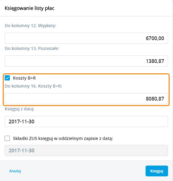 W przypadku księgowania list płac Użytkownik ma możliwość wybrania jakie wartości mają trafić do kolumny (12) Wynagrodzenia, (13) Pozostałe. Domyślnie wartości przenoszone są z odpowiedniej listy/ kilku list. W sytuacji, gdy firma będzie miała pracowników prowadzących badania, Użytkownik może zaznaczyć parametr Koszty B+R (domyślnie nie będzie zaznaczony), wtedy w pozycji (16) Koszty B+R, wartość zostanie uzupełniona automatycznie łączną kwotą z pozycji (12) Wypłaty i (13) Pozostałe.