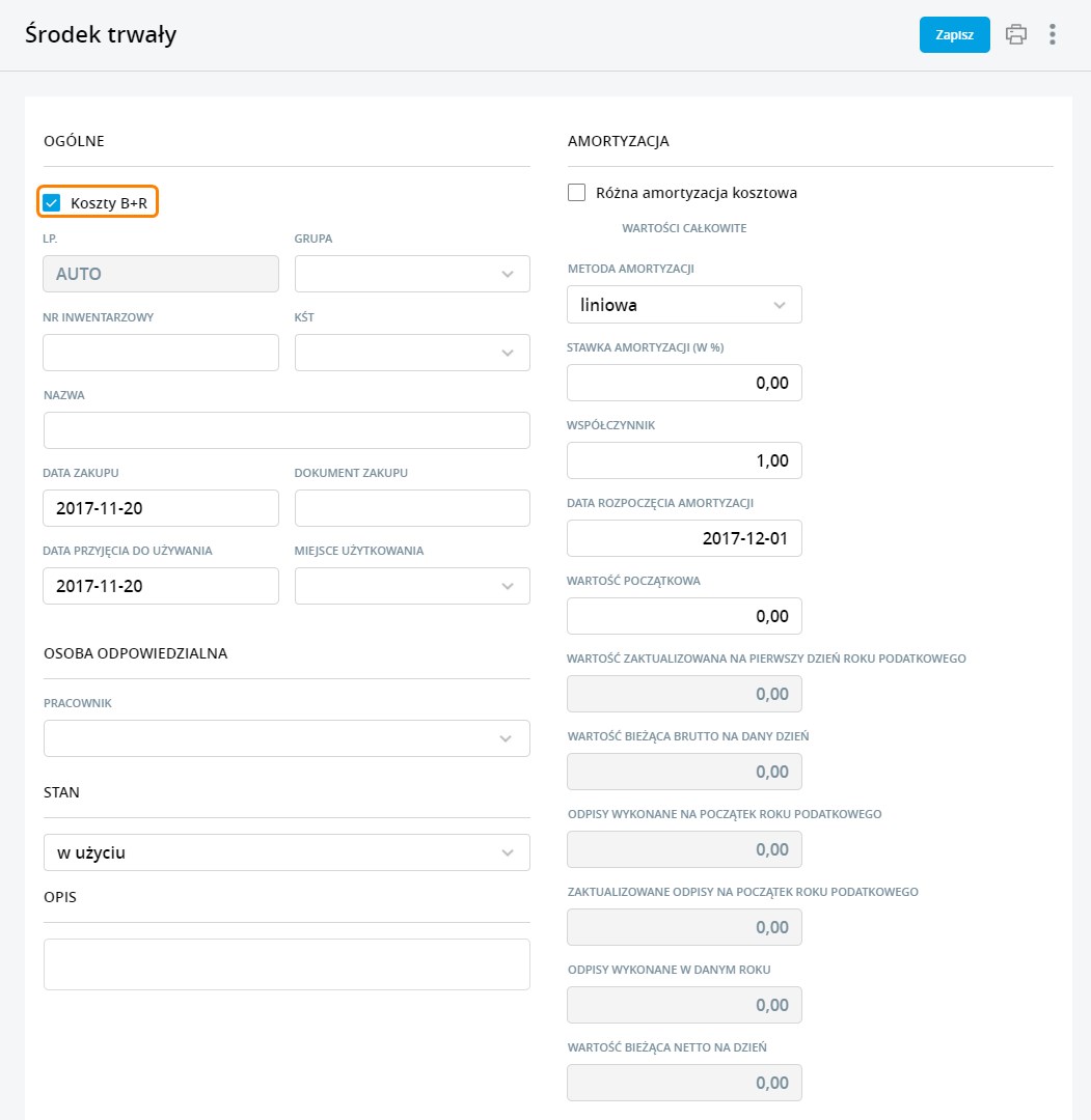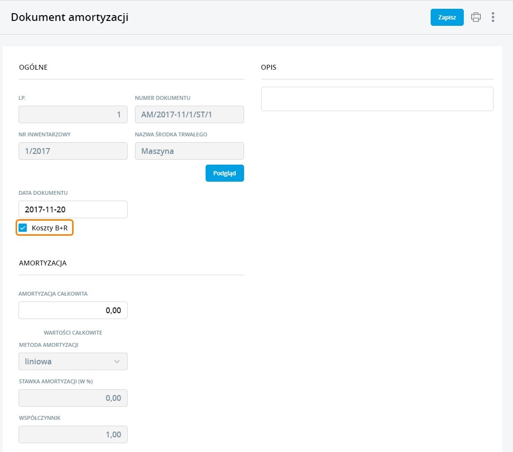 Na każdym dokumencie amortyzacji znajduje się parametr Koszty B+R. W sytuacji, gdy Użytkownik zaznaczy na karcie środka trwałego parametr Koszty B+R, na zapisie księgowym wygenerowanym do odpisu amortyzacyjnego w pozycji (16) Opis kosztu, powstanie zapis „Koszty amortyzacji”. Podobna sytuacja będzie miała miejsce w chwili, gdy na dokumencie amortyzacji dodanym ręcznie zostanie zaznaczony parametr.