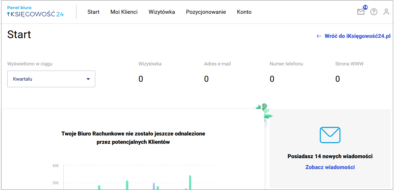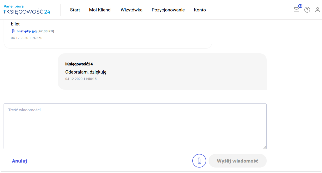 W górnej części pulpitu aplikacji znajduje się ikona koperty. Po jej wybraniu następuje przejście do panelu wiadomości, gdzie można komunikować się z Biurem Rachunkowym, z którym jest uruchomiona wymiana danych.