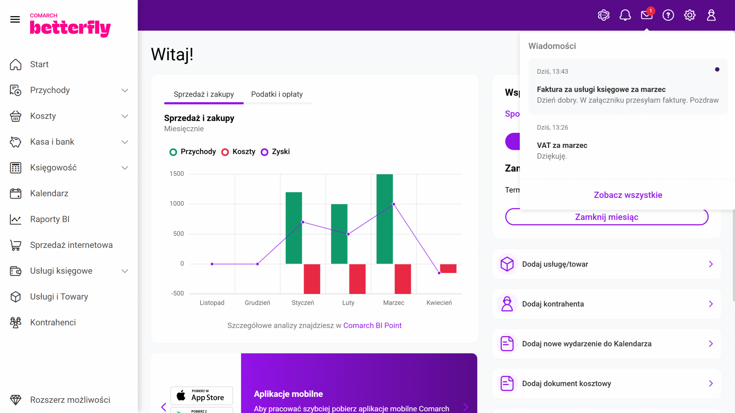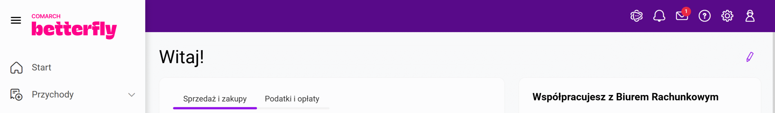 Klient Comarch Betterfly ma możliwość wysyłania wiadomości do Biura Rachunkowego, z którym ma uruchomioną wymianę danych. Podgląd wiadomości jest dostępny po kliknięciu ikony koperty w górnej sekcji.