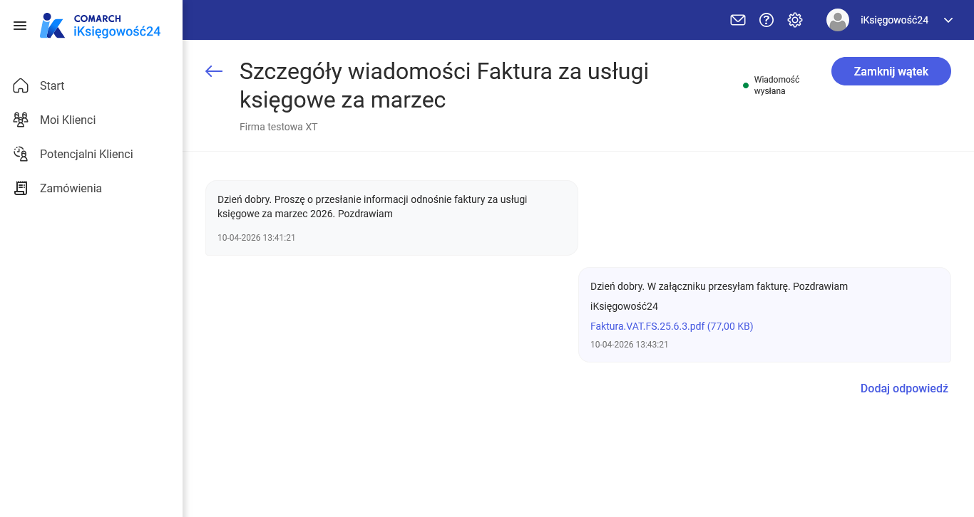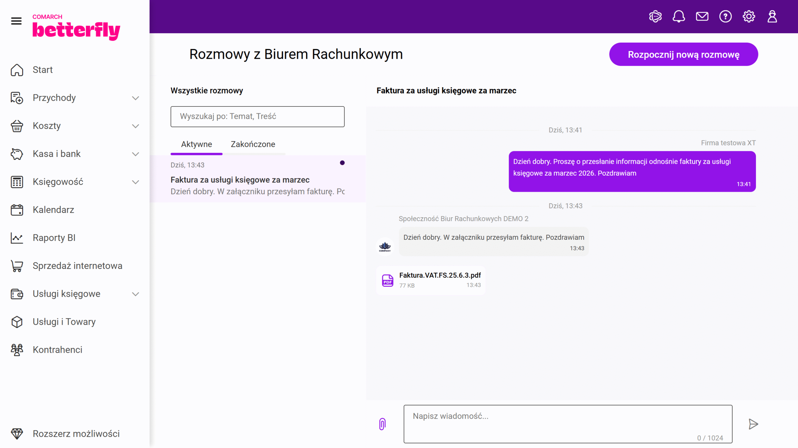 Widoczny jest również przycisk Zobacz wszystkie, po wybraniu którego następuje przejście do panelu wiadomości. Panel jest podzielony na dwie sekcje: panel z treścią wiadomości oraz lista rozmów. Rozmowy są podzielone na Aktywne i Zamknięte. Zamknięcie rozmowy dokonywane jest po stronie Biura Rachunkowego. Użytkownik będzie miał jedynie możliwość podglądu takiej rozmowy, bez możliwości dalszych odpowiedzi.