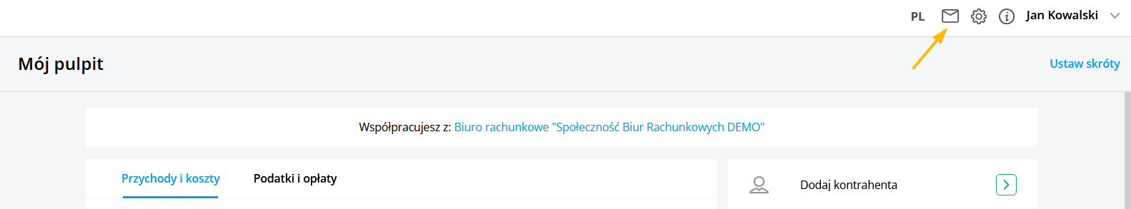 Po otrzymaniu nowej wiadomości od Biura Rachunkowego obok ikony koperty pojawi się niebieski alert i ilością nowych nieprzeczytanych wiadomości. Po kliknięciu w ikonę koperty rozwijana jest lista wiadomości zawierająca 3 wiadomości.