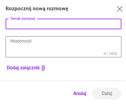 Poza wiadomością tekstową Użytkownik ma możliwość dodania jednego załącznika do 5MB – obsługiwane są pliki z grupy rozszerzeń .jpg, .jpeg, .png, .doc, .docx, .pdf, .xlx, .xlxs, .txt. Aby wysłać załącznik konieczne jest ponadto uzupełnienie treści wiadomości. Bez wpisania treści wiadomości opcja wysyłki załącznika nie będzie dostępna.