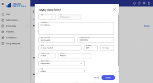 Informacje o koncie zawierają takie dane firmy jak: numer NIP, nazwa, dane teleadresowe. Jeśli chcesz dokonać zmiany w swoich danych, wystarczy kliknąć w ikonę ołówka lub opcję „Edytuj”. Wówczas wybrane pola będą dostępne do aktualizacji.