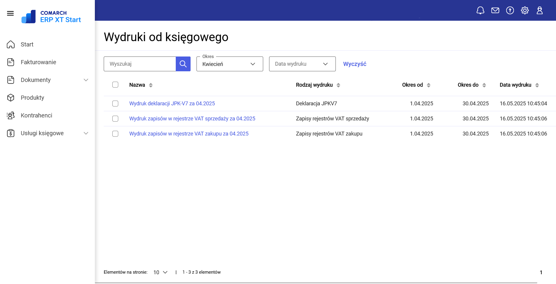 Na liście Wydruki od księgowego, po odebraniu danych od Księgowego, będą dostępne wydruki dotyczące zaliczek i deklaracji, zapisów księgowych oraz rejestrów VAT.