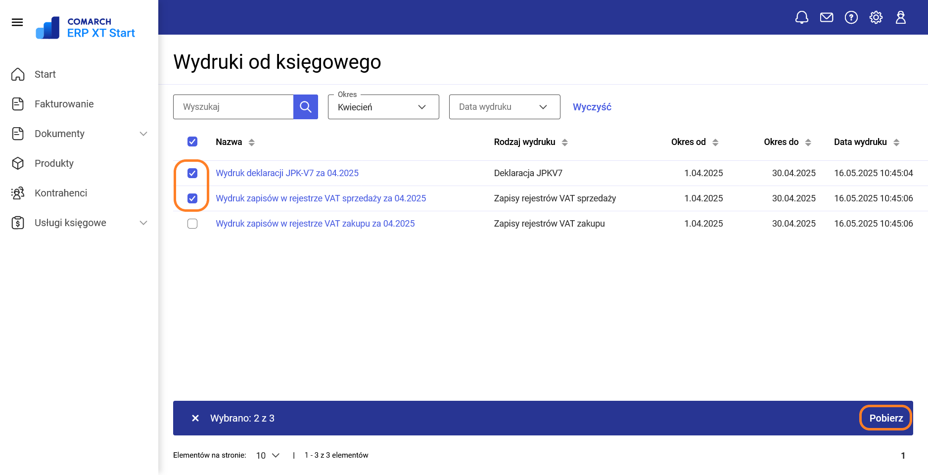 Po zaznaczeniu na liście jednego, bądź kilku wydruków jest dostępna opcja Pobierz. Po jej kliknięciu zostanie pobrany plik .pdf zawierający wydruk (jeśli zaznaczony był jeden wydruk) lub plik w formacie .zip zawierający kilka wydruków (jeśli na liście zostało zaznaczonych kilka wydruków).