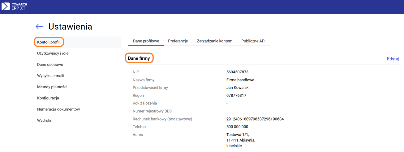 Nowa wersja pieczątki jest rejestrowana w programie w momencie zmiany danych w Konfiguracja/ Konto i profil zakładka Dane profilowe w sekcji Dane firmy