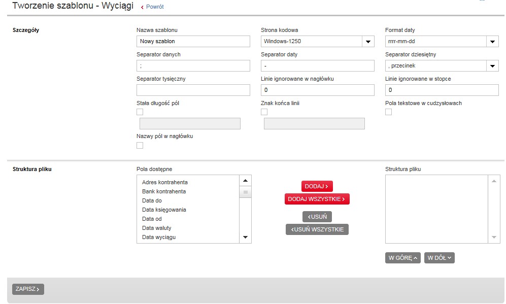 W systemie bankowym możliwość tworzenia szablonów eksportów jest z poziomu Eksport danych transakcyjnych-> Stwórz nowy szablon. Natomiast eksport danych z Operacje bankowe-> Eksport danych transakcyjnych – wybieramy konkretny szablon. Podczas tworzenia szablonu należy zaznaczyć parametr „Nazwy pól w nagłówku”