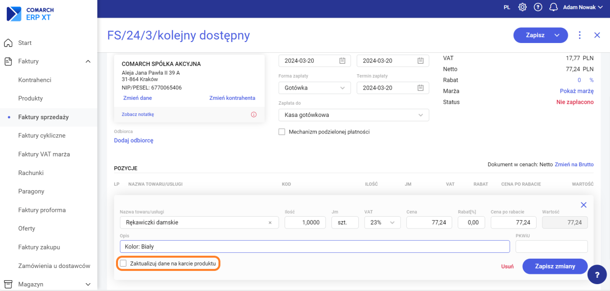 Podczas edycji pozycji na dokumencie (np. zmiana ceny produktu) pojawia się parametr ‘Zaktualizuj dane na karcie produktu’. Zaznaczenie parametru i zapisanie zmian na pozycji spowoduje aktualizację odpowiednich danych na karcie produktu.