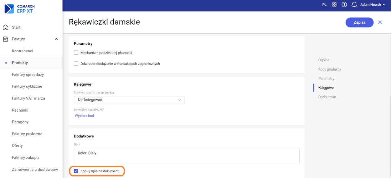 Na karcie produktu w sekcji Dodatkowe znajduje się pole Opis oraz parametr 'Kopiuj opis na dokument’.