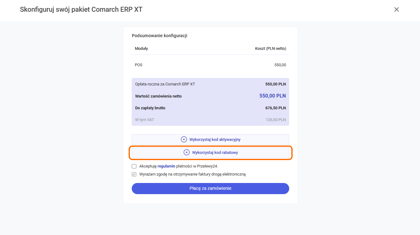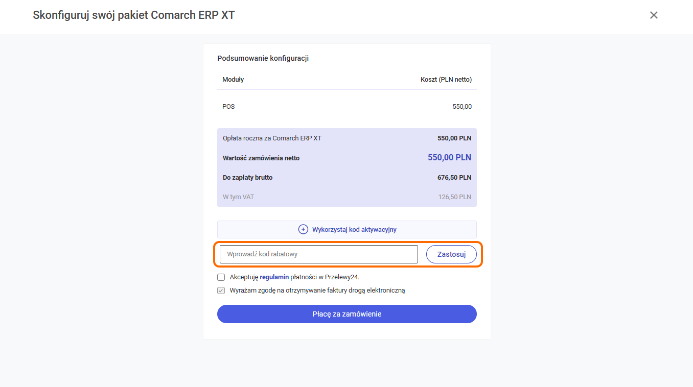 Po zastosowaniu kodu rabatowego wartość modułu/ modułów, których dotyczył rabat, zostaje pomniejszona o odpowiednią wartość.