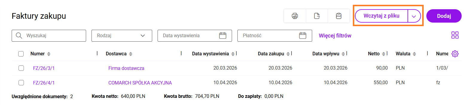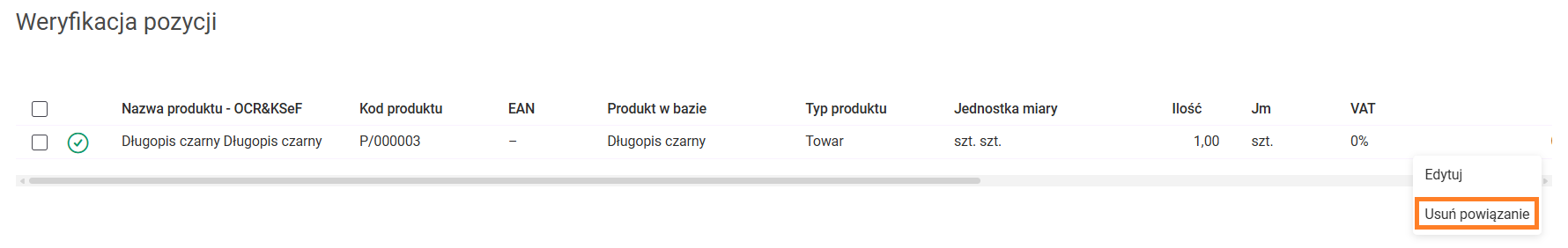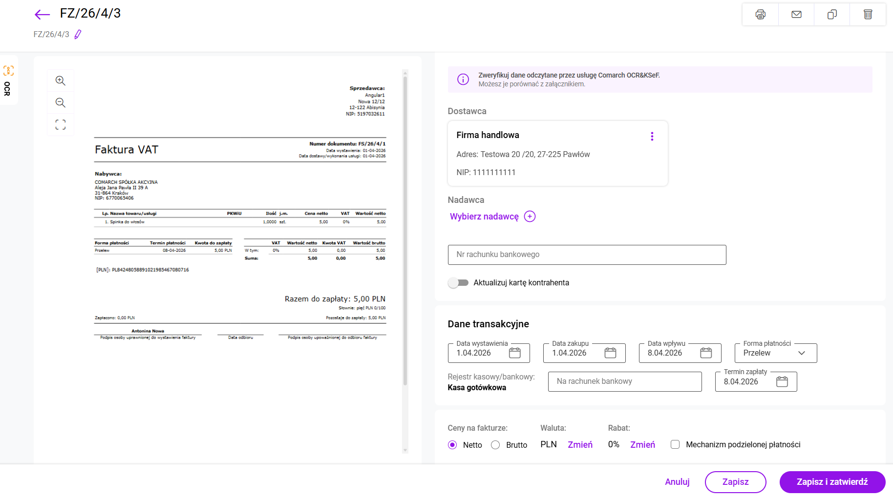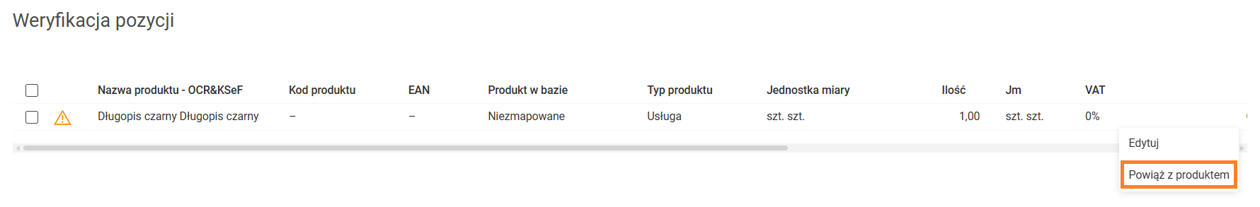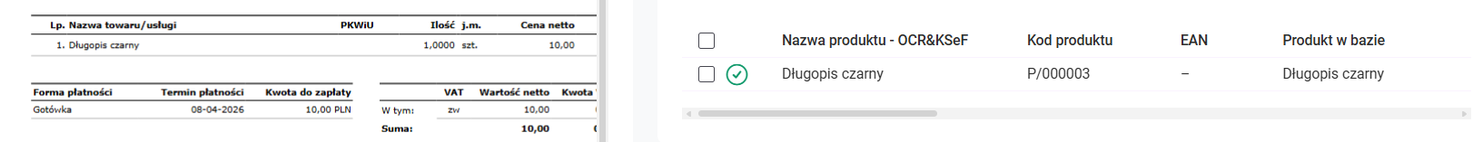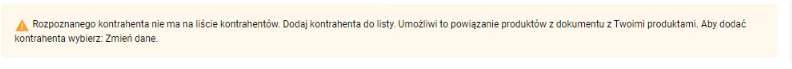 Jak dodać dokument na liście Faktury zakupu? Na liście Faktury zakupu wybierz przycisk: Wczytaj z pliku. Następnie wskaż pliki z fakturami, które chcesz wczytać. Po rozpoczęciu przetwarzania dokumentów, na ekranie widoczne jest okno z informacją o przetwarzanych dokumentach. Dla każdego dokumentu Użytkownik widzi informację czy przetwarzanie zakończyło się poprawnie. Wraz z dodaniem faktury zakupu, na zakładce Załączniki zapisywany jest również plik, z którego został odczytany dokument. Comarch OCR&KSeF rozpoznaje dane z faktur zakupu w walutach PLN, EUR, USD i GBP. Rozpoznawane są zarówno dokumenty z pojedynczych plików (jeden dokument to jeden plik) oraz wiele dokumentów znajdujących się w jednym pliku pdf. Rozpoznawane są następujące dane: Usługa Comarch OCR&KSeF nie pozwala na wprowadzenie kilka razy tego samego dokumentu. Przy rozpoznawaniu dokumentów wprowadzona jest kontrola duplikacji, która sprawdza, czy na liście Faktur zakupu znajduje się już dokument o takich samych danych: Weryfikacja przetworzonych dokumentów Po zakończeniu przetwarzania, na liście faktur zakupu wczytane dokumenty zostaną oznaczone statusem OCR: Dokumenty wprowadzone przez Comarch OCR&KSeF na listę Faktur zakupu powinny zostać zweryfikowane przez Użytkownika pod kątem poprawności zaimportowanych danych, a następnie Zatwierdzone na stałe. Niezweryfikowane dokumenty (na liście faktur zakupu oznaczone pomarańczowym symbolem [OCR]) otwierane są na specjalnym widoku, aby użytkownik mógł porównać skan faktury z danymi, jakie zostały odczytane: Szczególną uwagę podczas weryfikacji zwracamy na dane, które są rozpoznawane: Przypisanie karty produktu do pozycji z dokumentu Podczas wprowadzania faktury zakupu przez OCR program próbuje powiązać pozycje z faktury z kartami produktów zarejestrowanych w systemie. Powiązanie jest tworzone na podstawie: Jeśli program nie znajdzie odpowiednich produktów, z którymi może powiązać pozycję automatycznie, Użytkownik może wskazać takie powiązanie bezpośrednio na fakturze zakupu. Na tej podstawie tworzona jest mapa powiązań produktów zarejestrowanych na koncie z danymi otrzymywanymi z OCR. Jeśli dla danej pozycji z dokumentu istnieje powiązanie, zostanie ono użyte przez system w przyszłości dla rozpoznania analogicznej pozycji. Mapa powiązań aktualizowana jest automatycznie przez system na podstawie operacji wykonanych przez Użytkownika, takich jak: oraz na podstawie automatycznych powiązań pozycji dokumentu do produktów z listy realizowanych w oparciu o nazwę produktu lub kod EAN. Mapa powiązań produktów jest tworzona dla każdego kontrahenta odrębnie. Dlatego automatyczne dopasowanie produktu do pozycji faktury jest możliwe tylko na fakturach wystawionych przez kontrahentów, którzy mają utworzoną kartę kontrahenta. Jeśli podczas wprowadzania faktury zakupu nie uda się rozpoznać kontrahenta, program nie może korzystać z utworzonej mapy powiazań pomiędzy produktami, to pojawi się ostrzeżenie: W zależności od tego, czy pozycję faktury uda się powiązać z produktem, elementy dokumentu mogą być oznaczone jako: Nowy produkt tworzony z poziomu faktury zakupu wprowadzonej przez Comarch OCR&KSeF, jest zawsze oznaczany jako towar. Dodatkowo w przypadku Użytkowników posiadających pakiet Magazyn od razu jest zaznaczony parametr: Kontrola stanu towaru w magazynie. Dane na karcie produktu podlegają edycji. Podczas weryfikacji faktury zakupu program pozwala na pełną edycję pozycji: Jeśli Użytkownik wysyła dane do Biura Rachunkowego może również na fakturze zakupu wskazać Kategorię wydatku. Na tej podstawie zostaną automatycznie uzupełnione dane wykorzystywane w Rejestrze VAT zakupów. Jeśli na dokumencie zostały wprowadzone zmiany Użytkownik może: