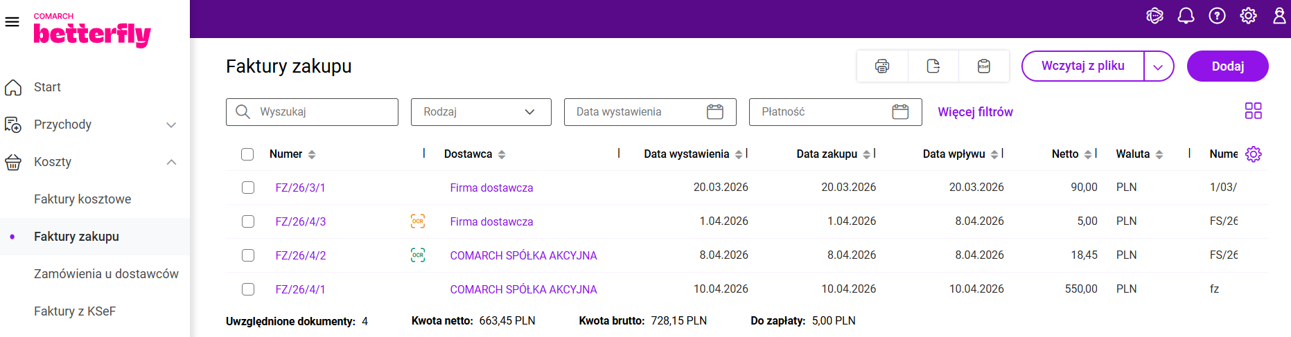 W aplikacji Comarch Betterfly istnieje możliwość skorzystania z usługi Comarch OCR&KSeF, która pozwala na odczytanie zdjęcia/skanu faktury i wprowadzenie faktur zakupu w module Faktury oraz dokumentów kosztowych w module Księgowość.