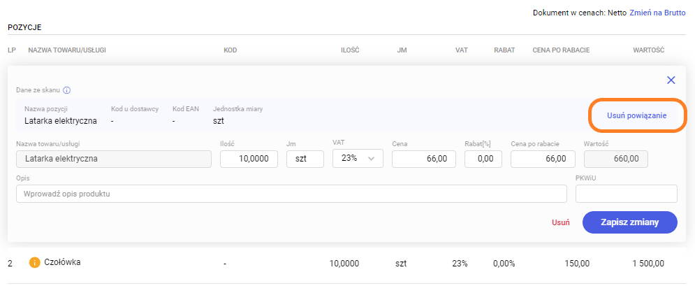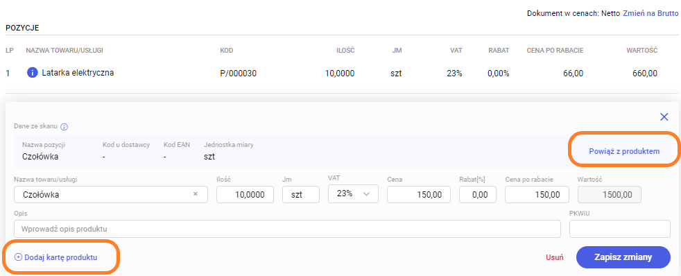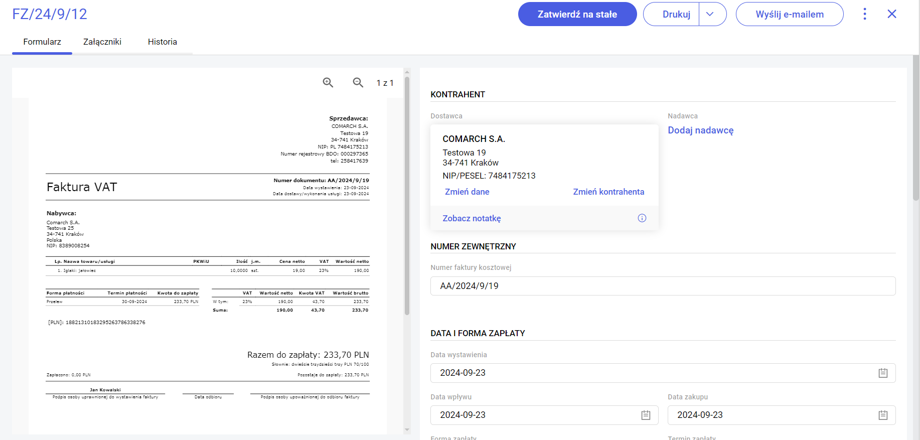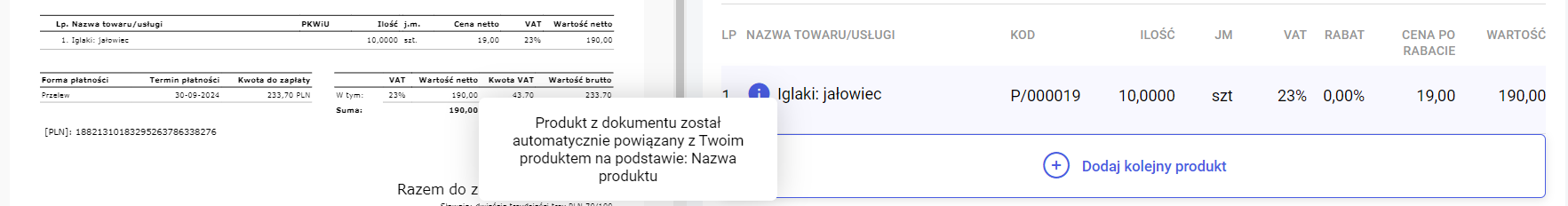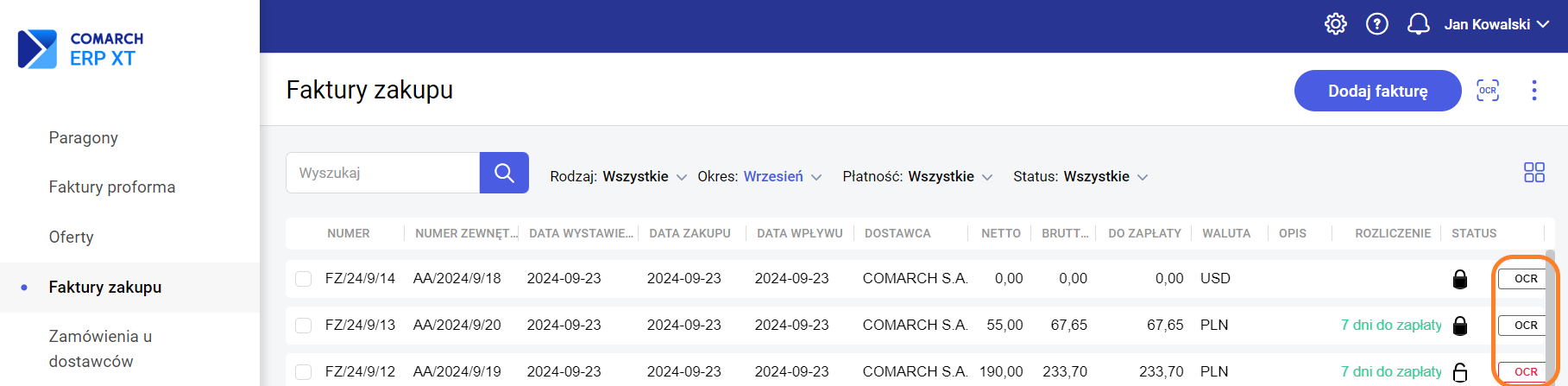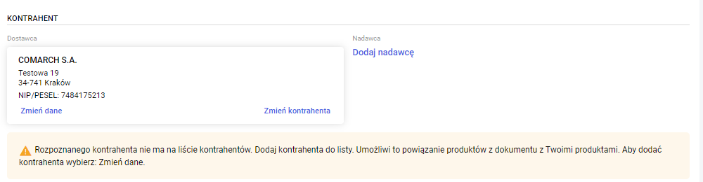 Jak dodać dokument na liście Faktury zakupu? Na liście Faktury zakupu wybierz przycisk [OCR]: Następnie wskaż pliki z fakturami, które chcesz wczytać. Po rozpoczęciu przetwarzania dokumentów, na ekranie widoczne jest okno z informacją o przetwarzanych dokumentach. Dla każdego dokumentu Użytkownik widzi informację czy przetwarzanie zakończyło się poprawnie. Wraz z dodaniem faktury zakupu, na zakładce Załączniki zapisywany jest również plik, z którego został odczytany dokument. Comarch OCR&KSeF rozpoznaje dane z faktur zakupu w walutach PLN, EUR, USD i GBP. Rozpoznawane są zarówno dokumenty z pojedynczych plików (jeden dokument to jeden plik) oraz wiele dokumentów znajdujących się w jednym pliku pdf. Rozpoznawane są następujące dane: Usługa Comarch OCR&KSeF nie pozwala na wprowadzenie kilka razy tego samego dokumentu. Przy rozpoznawaniu dokumentów wprowadzona jest kontrola duplikacji, która sprawdza, czy na liście Faktur zakupu znajduje się już dokument o takich samych danych: Weryfikacja przetworzonych dokumentów Po zakończeniu przetwarzania, na liście faktur zakupu wczytane dokumenty zostaną oznaczone statusem OCR: Dokumenty wprowadzone przez Comarch OCR&KSeF na listę Faktur zakupu powinny zostać zweryfikowane przez Użytkownika pod kątem poprawności zaimportowanych danych, a następnie Zatwierdzone na stałe. Niezweryfikowane dokumenty (na liście faktur zakupu oznaczone czerwonym symbolem [OCR]) otwierane są na specjalnym widoku, aby użytkownik mógł porównać skan faktury z danymi, jakie zostały odczytane: Szczególną uwagę podczas weryfikacji zwracamy na dane, które są rozpoznawane: Przypisanie karty produktu do pozycji z dokumentu Podczas wprowadzania faktury zakupu przez OCR program próbuje powiązać pozycje z faktury z kartami produktów zarejestrowanych w systemie. Powiązanie jest tworzone na podstawie: Jeśli program nie znajdzie odpowiednich produktów, z którymi może powiązać pozycję automatycznie, Użytkownik może wskazać takie powiązanie bezpośrednio na fakturze zakupu. Na tej podstawie tworzona jest mapa powiązań produktów zarejestrowanych na koncie z danymi otrzymywanymi z OCR. Jeśli dla danej pozycji z dokumentu istnieje powiązanie, zostanie ono użyte przez system w przyszłości dla rozpoznania analogicznej pozycji. Mapa powiązań aktualizowana jest automatycznie przez system na podstawie operacji wykonanych przez Użytkownika, takich jak: oraz na podstawie automatycznych powiązań pozycji dokumentu do produktów z listy realizowanych w oparciu o nazwę produktu lub kod EAN. Mapa powiązań produktów jest tworzona dla każdego kontrahenta odrębnie. Dlatego automatyczne dopasowanie produktu do pozycji faktury jest możliwe tylko na fakturach wystawionych przez kontrahentów, którzy mają utworzoną kartę kontrahenta. Jeśli podczas wprowadzania faktury zakupu nie uda się rozpoznać kontrahenta, program nie może korzystać z utworzonej mapy powiazań pomiędzy produktami: Aby utworzyć kartę kontrahenta na wprowadzonym dokumencie należy kliknąć w Zmień dane, sprawdzić czy wszystkie dane się zgadzają i kliknąć Dodaj. W zależności od tego, czy pozycję faktury uda sie powiązać z produktem, elementy dokumentu mogą być oznaczone jako: Nowa produkt tworzony z poziomu faktury zakupu wprowadzonej przez Comarch OCR&KSeF, jest zawsze oznaczany jako towar. Dodatkowo w przypadku Użytkowników posiadających pakiet Magazyn od razu jest zaznaczony parametr: Kontrola stanu towaru w magazynie. Dane na karcie produktu podlegają edycji. Podczas weryfikacji faktury zakupu program pozwala na pełną edycję pozycji: Jeśli Użytkownik wysyła dane do Biura Rachunkowego może również na fakturze zakupu wskazać Kategorię wydatku. Na tej podstawie zostaną automatycznie uzupełnione dane wykorzystywane w Rejestrze VAT zakupów. Jeśli na dokumencie zostały wprowadzone zmiany Użytkownik może: