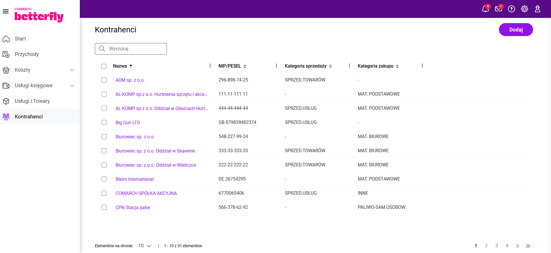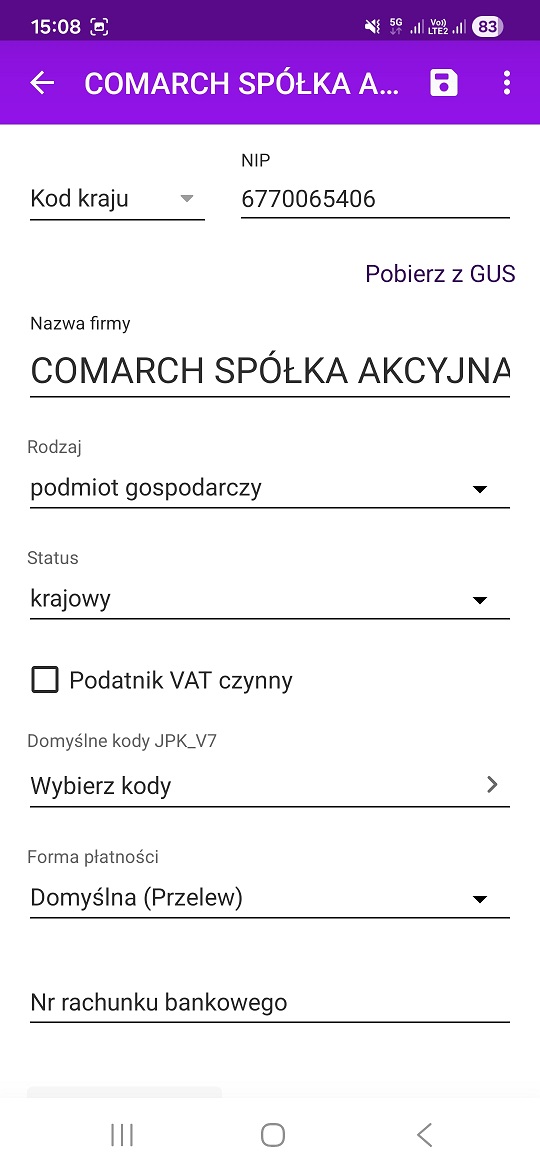 Po wpisaniu numeru NIP dane kontrahenta są automatycznie pobierane z GUS. Dodatkowo weryfikowany jest też status podatnika VAT.