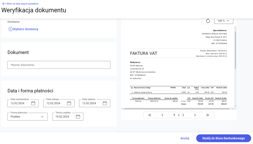 Wprowadzony dokument można wysłać do Biura Rachunkowego przyciskiem „Wyślij do Biura Rachunkowego”. Dokument po przesłaniu do Biura Rachunkowego będzie dostępny w trybie do odczytu. W każdej chwili będzie można także podejrzeć załącznik.