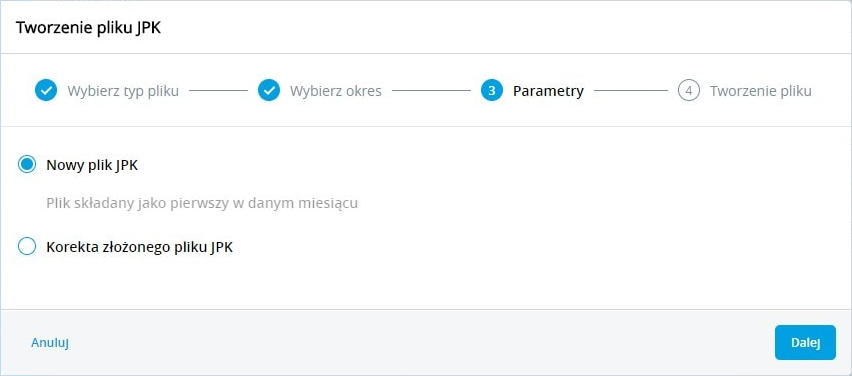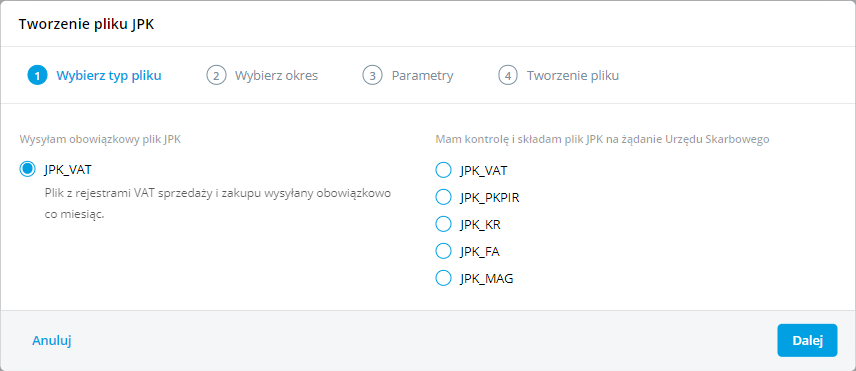 Na ekranie pojawi się kreator, na którym Użytkownik powinien wskazać jaki rodzaj pliku JPK chce stworzyć.
