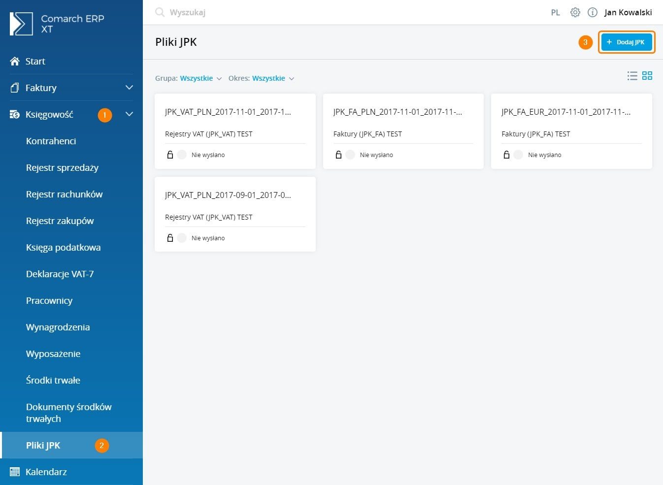 Tworzenie plików JPK oraz ich eksport odbywa się z poziomu Księgowość / Pliki JPK. Aby dodać plik JPK należy wybrać przycisk „Dodaj JPK”.