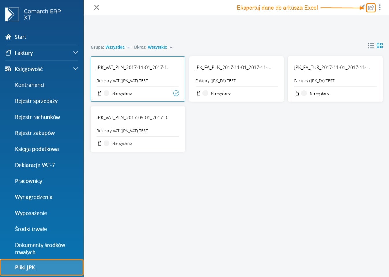 Arkusz Excel można również pobrać po zaznaczeniu na liście pliku JPK, wtedy w menu kontekstowym widnieje opcja Eksportuj dane do arkusza Excel.