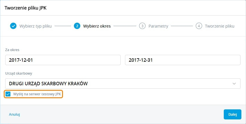 Na kolejnej zakładce należy wybrać zakres dat oraz zweryfikować poprawność Urzędu Skarbowego. Można również wskazać serwer testowy Ministerstwa Finansów. Aby to zrobić należy zaznaczyć parametr „Wyślij na serwer testowy JPK”.