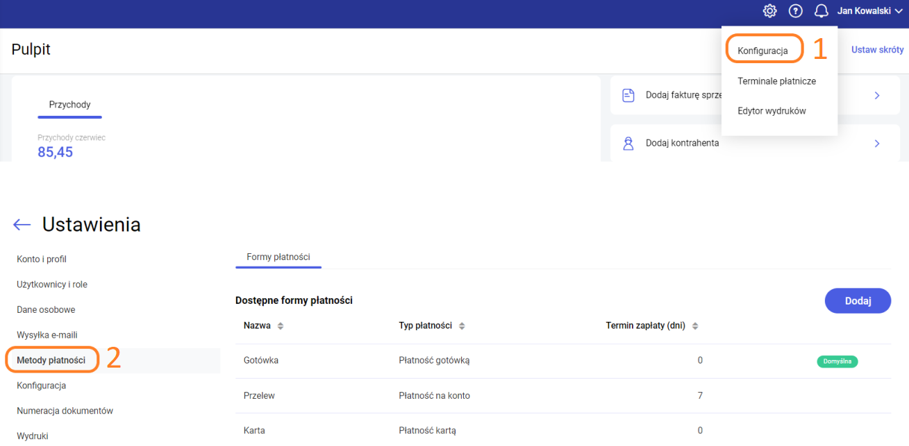 - Pod ikoną koła zębatego należy wybrać Konfiguracja a następnie Metody płatności
