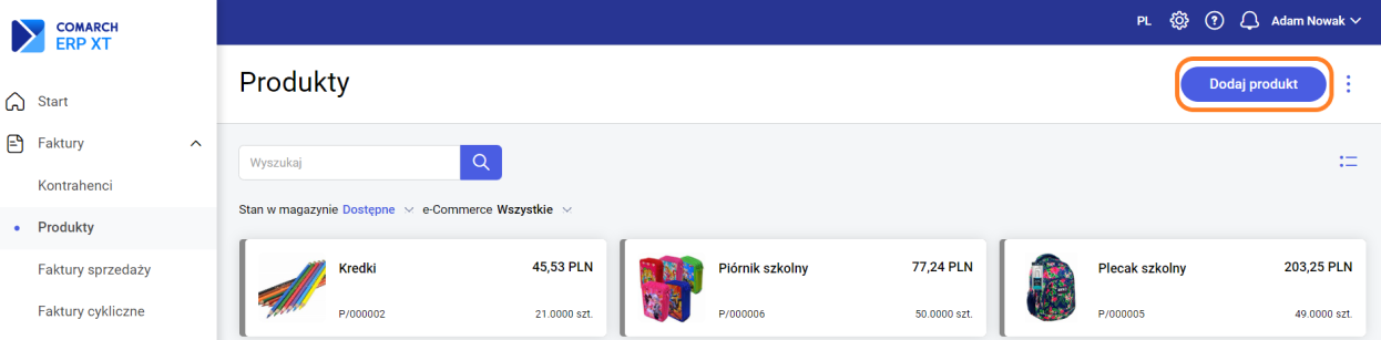 - Z poziomu Faktury >> Produkty; wybieramy kafelek „Dodaj produkt” widoczny w prawym górnym rogu.