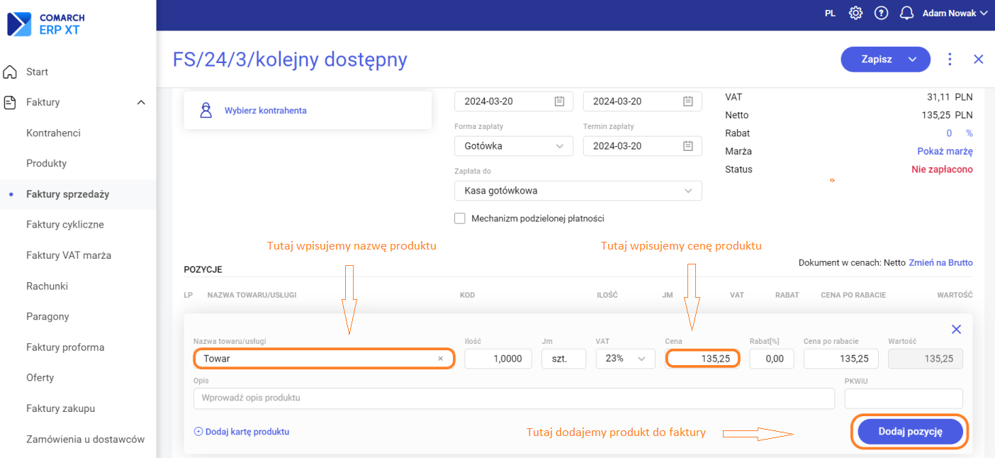 - Druga opcja dodania produktu znajduje się bezpośrednio na formularzu dokumentu. Podczas dodawania elementów np. na fakturze sprzedaży, jeśli wpiszemy nazwę produktu, którego nie ma jeszcze w bazie, program umożliwi nam jego zapis.